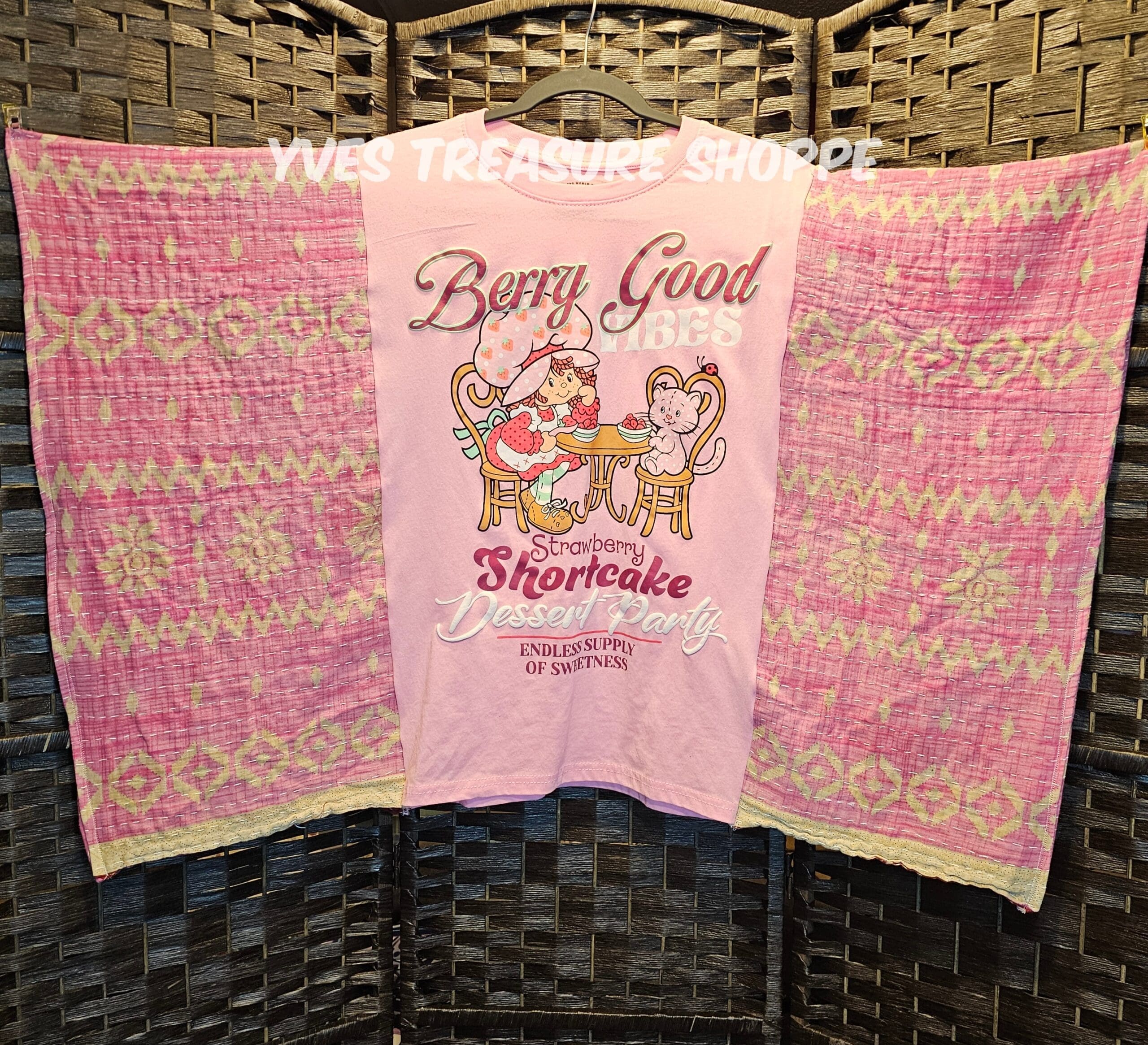 One Size. This Poncho top is made with a New large Strawberry Shortcake t-shirt and a vintage kantha quilt. 39.5 inches across. 25.5 inches from top to bottom. Sides are sewn partway up, to be able to be worn as a top. Perfect for making that fashion statement.