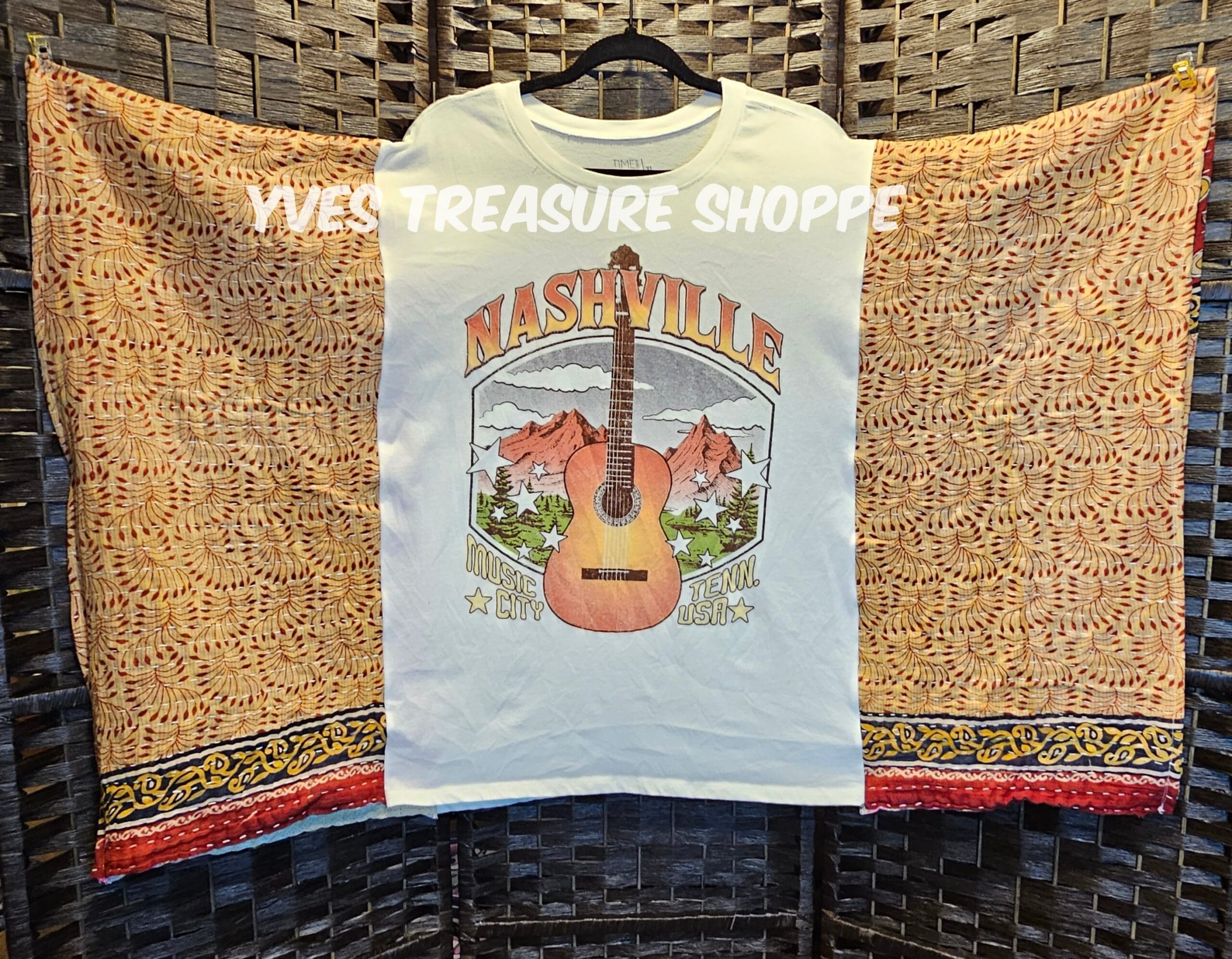 One Size. This Poncho top is made with a New XLarge Nashville t-shirt and a vintage kantha quilt. 43 inches across. 25.5 inches from top to bottom. Sides are sewn partway up, to be able to be worn as a top. Perfect for making that fashion statement.