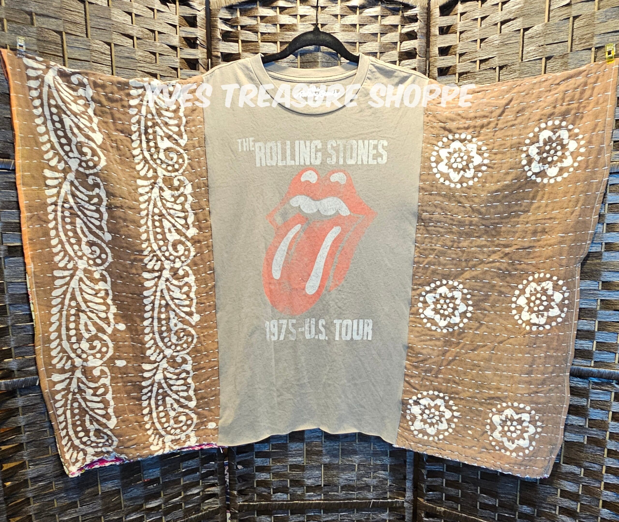 One Size. This Poncho top is made with a New Large Rolling Stones concert t-shirt and a vintage kantha quilt. 42 inches across. 28.5 inches from top to bottom. Sides are sewn partway up, to be able to be worn as a top. Perfect for making that fashion statement.
