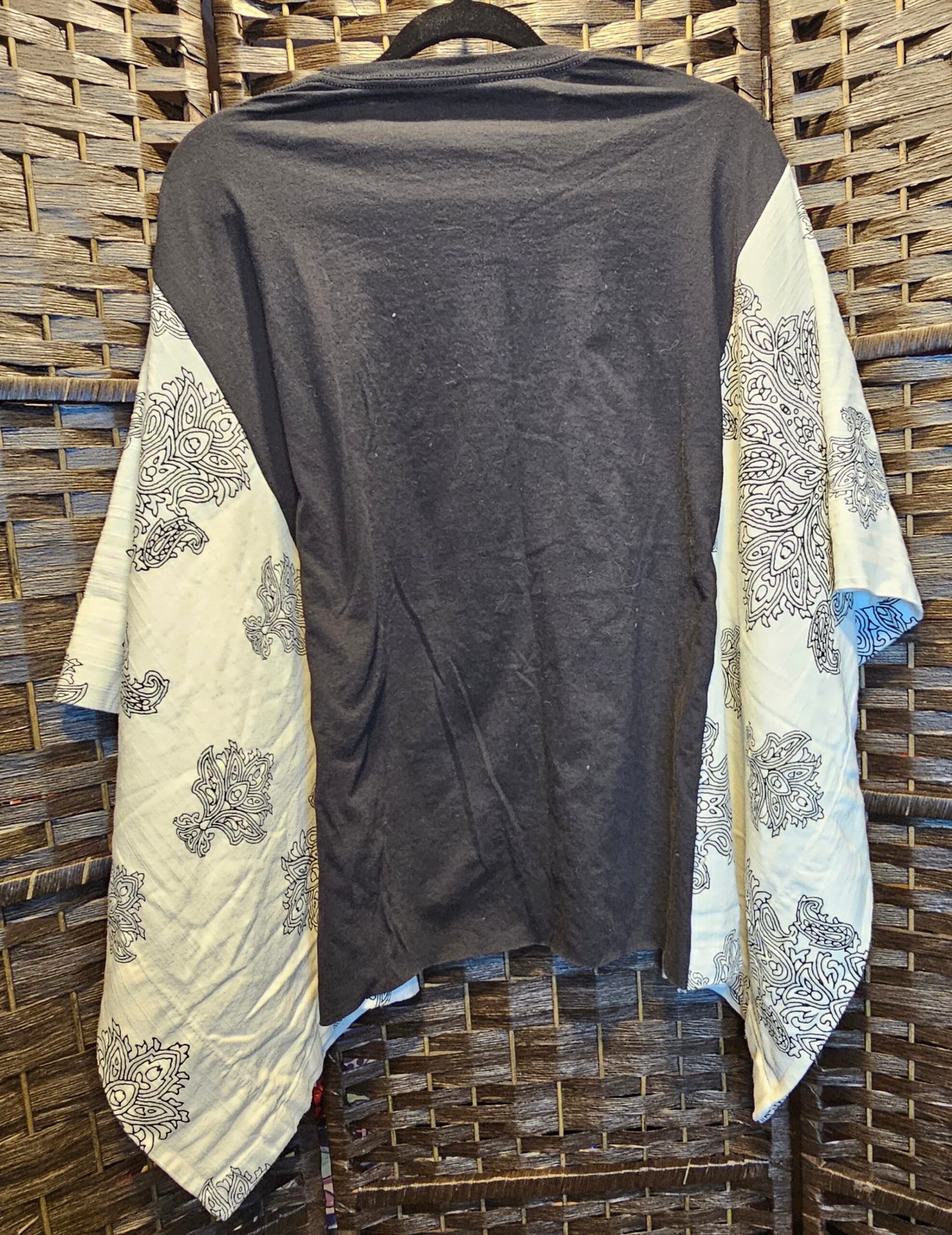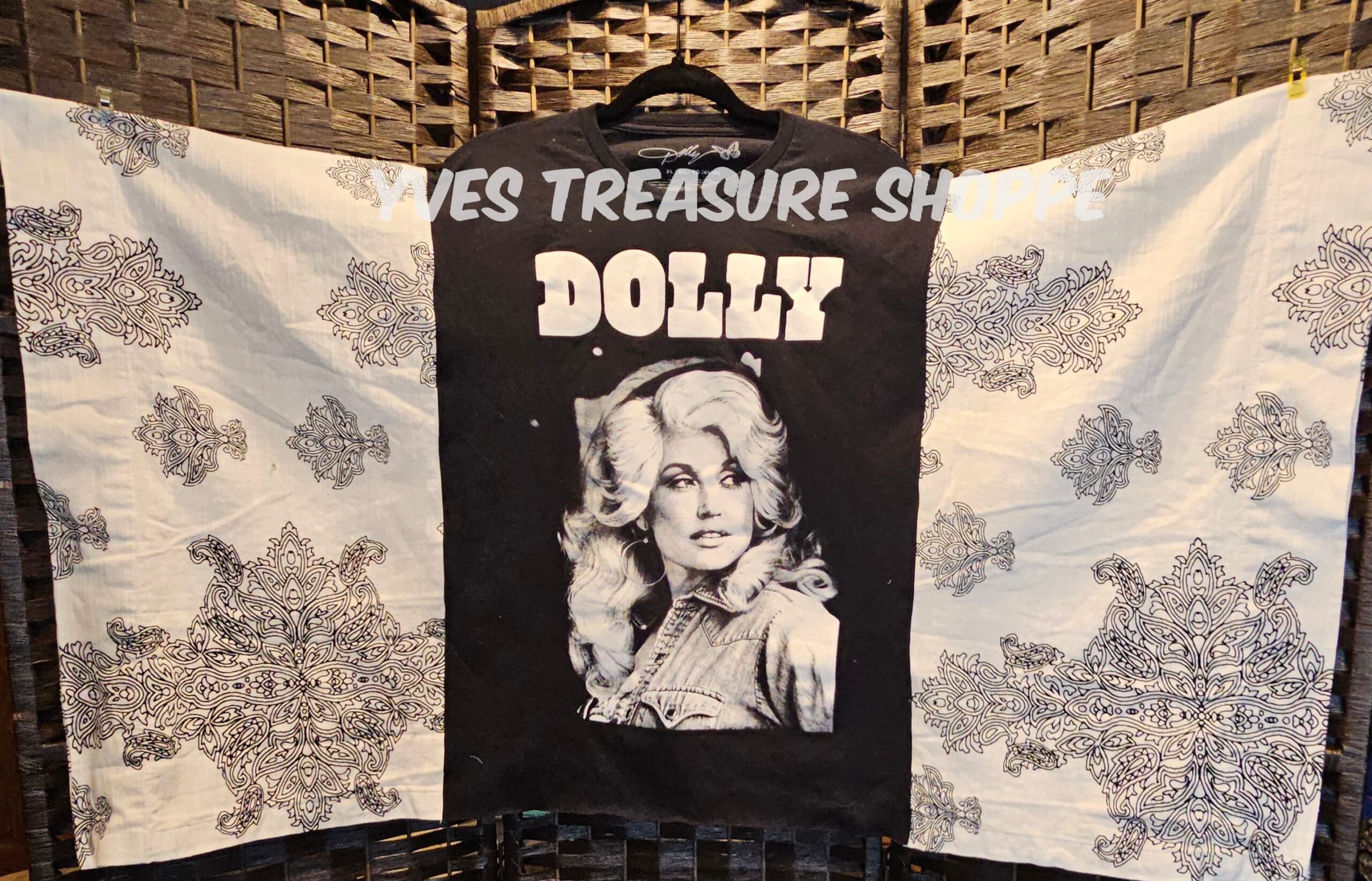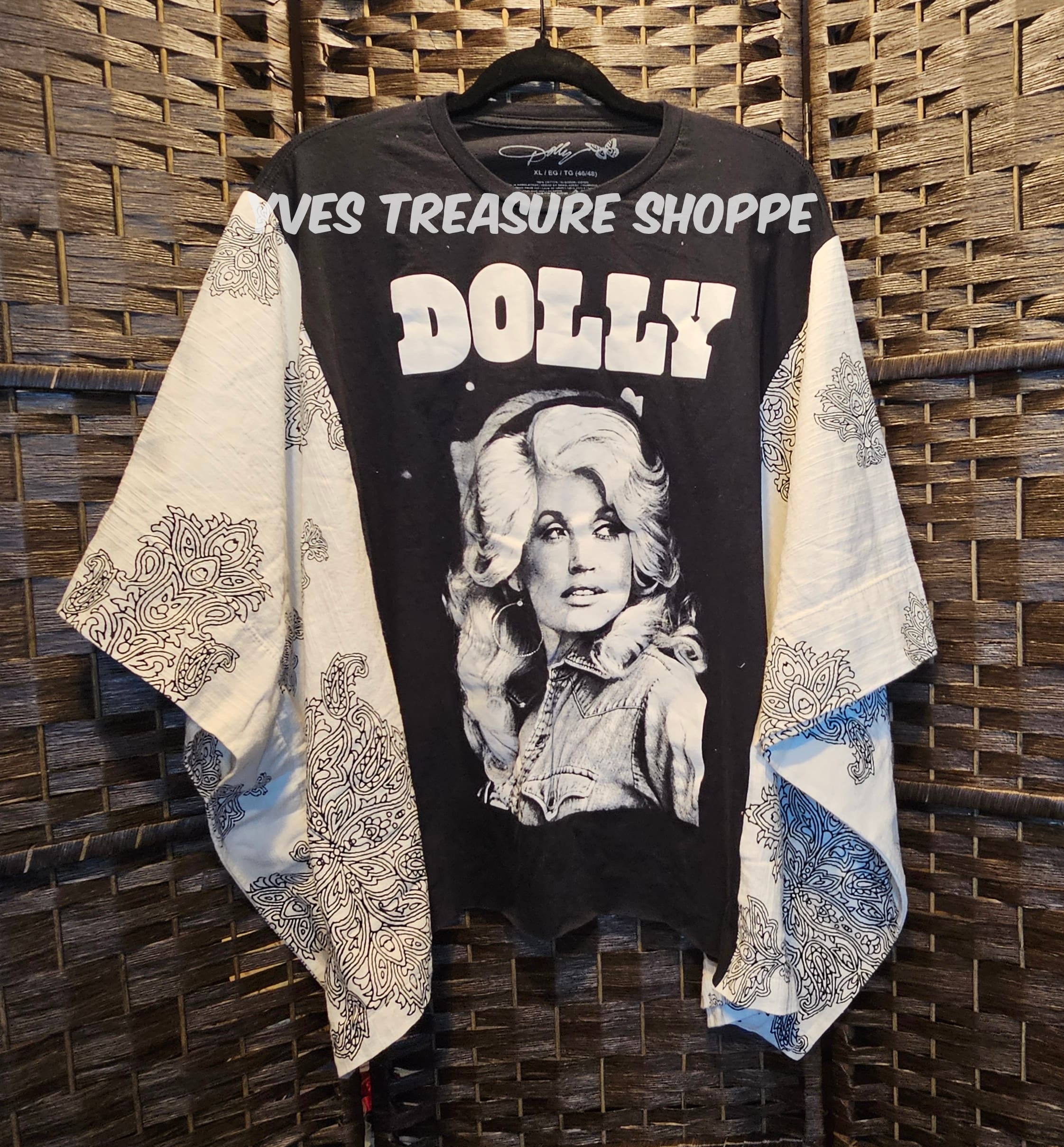 One Size. This Poncho top is made with a New XLarge Dolly concert t-shirt and a vintage curtain. 45 inches across. 24.5 inches from top to bottom. Sides are sewn partway up, to be able to be worn as a top. Perfect for making that fashion statement.