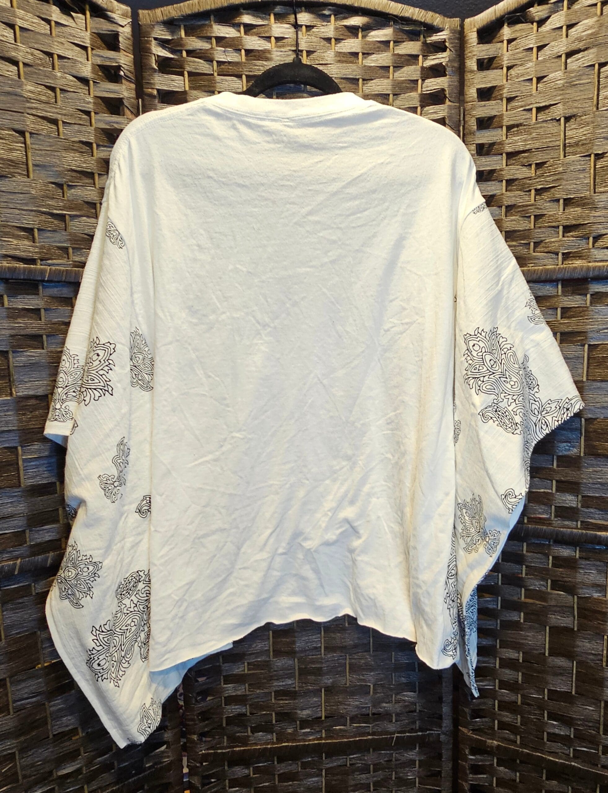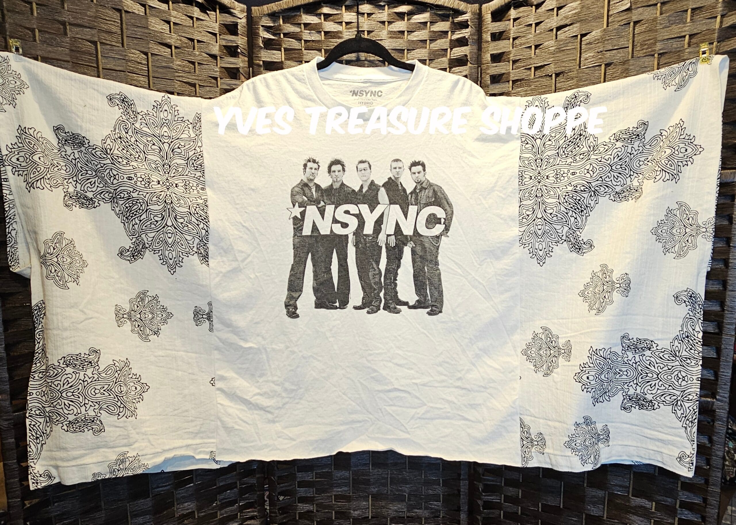 One Size. This Poncho top is made with a New XXLarge NSYNC concert t-shirt and a vintage curtain. 45 inches across. 24.5 inches from top to bottom. Sides are sewn partway up, to be able to be worn as a top. Perfect for making that fashion statement.