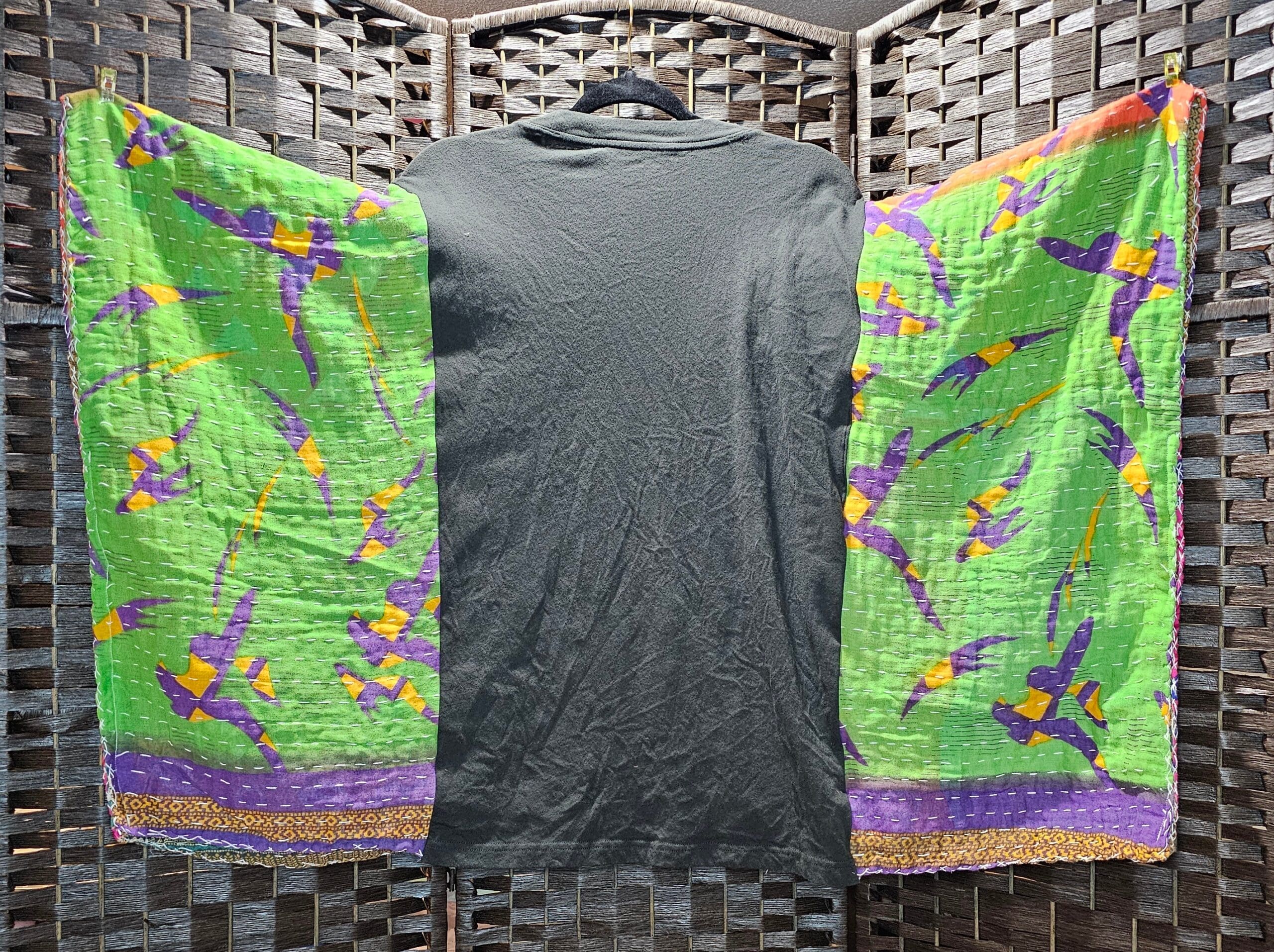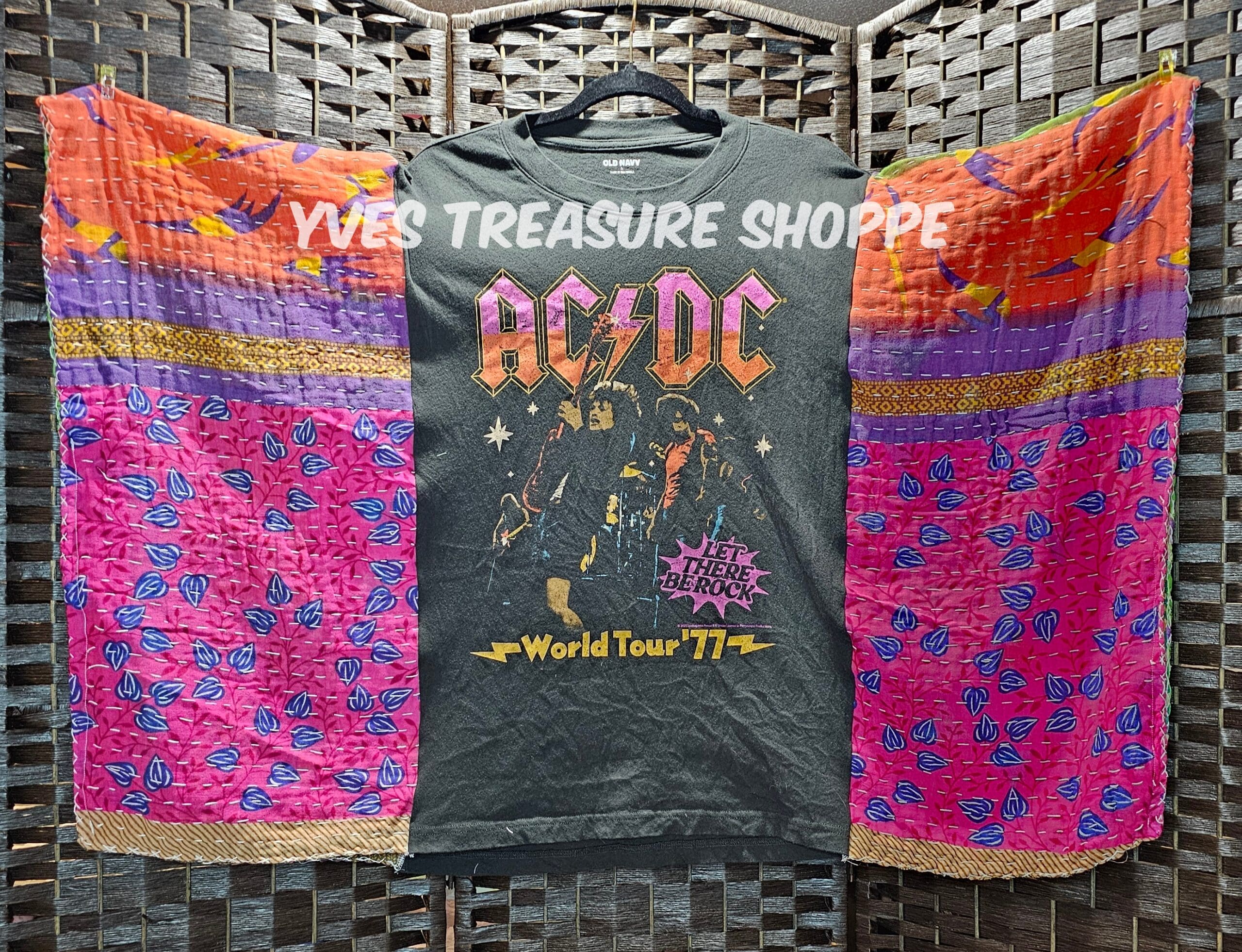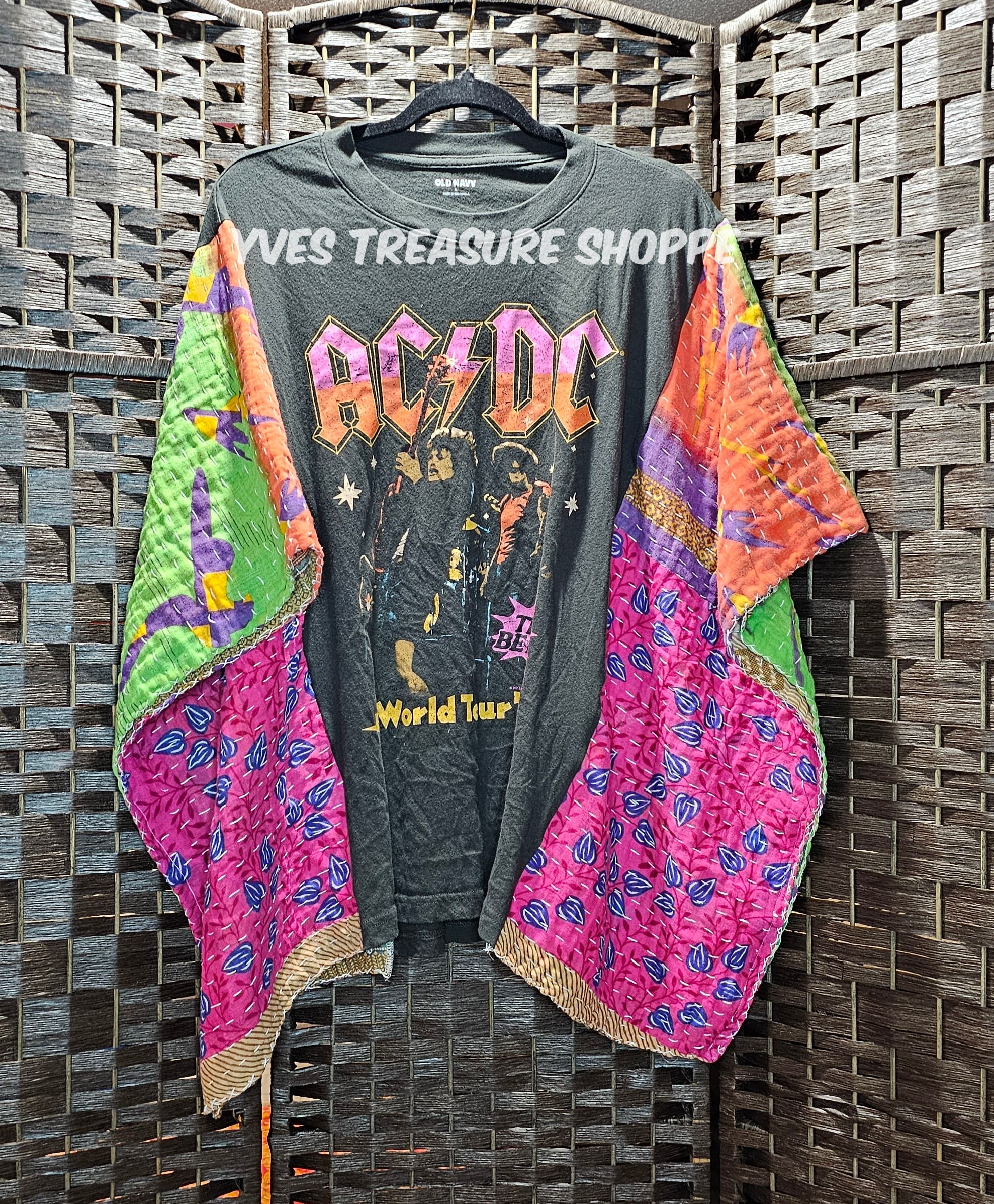 One Size. This Poncho top is made with a new refashioned Large AC/DC shirt and vintage kantha quilt. 44 inches across. 26 inches from top to bottom. Sides are sewn partway up, to be able to be worn as a top. Perfect for making that fashion statement.