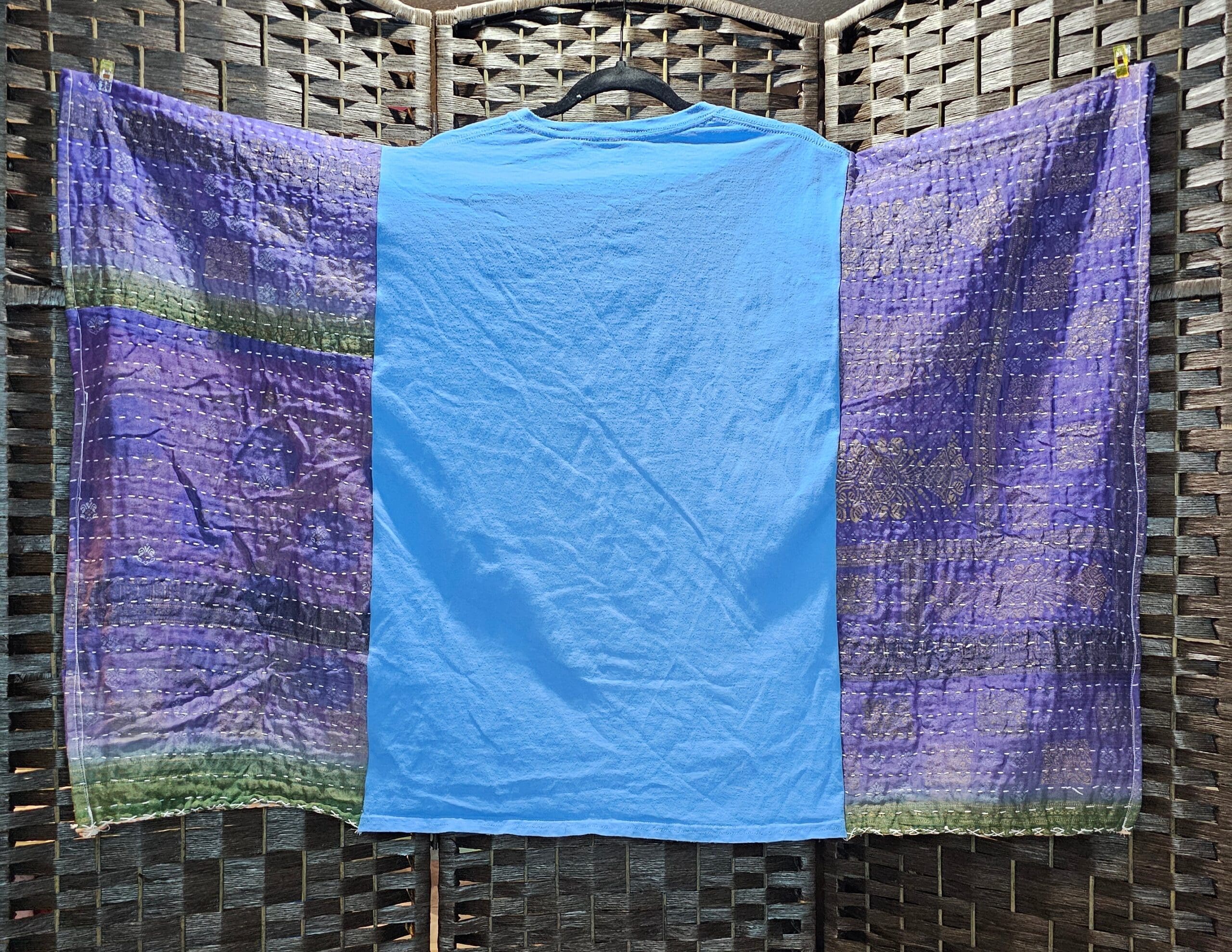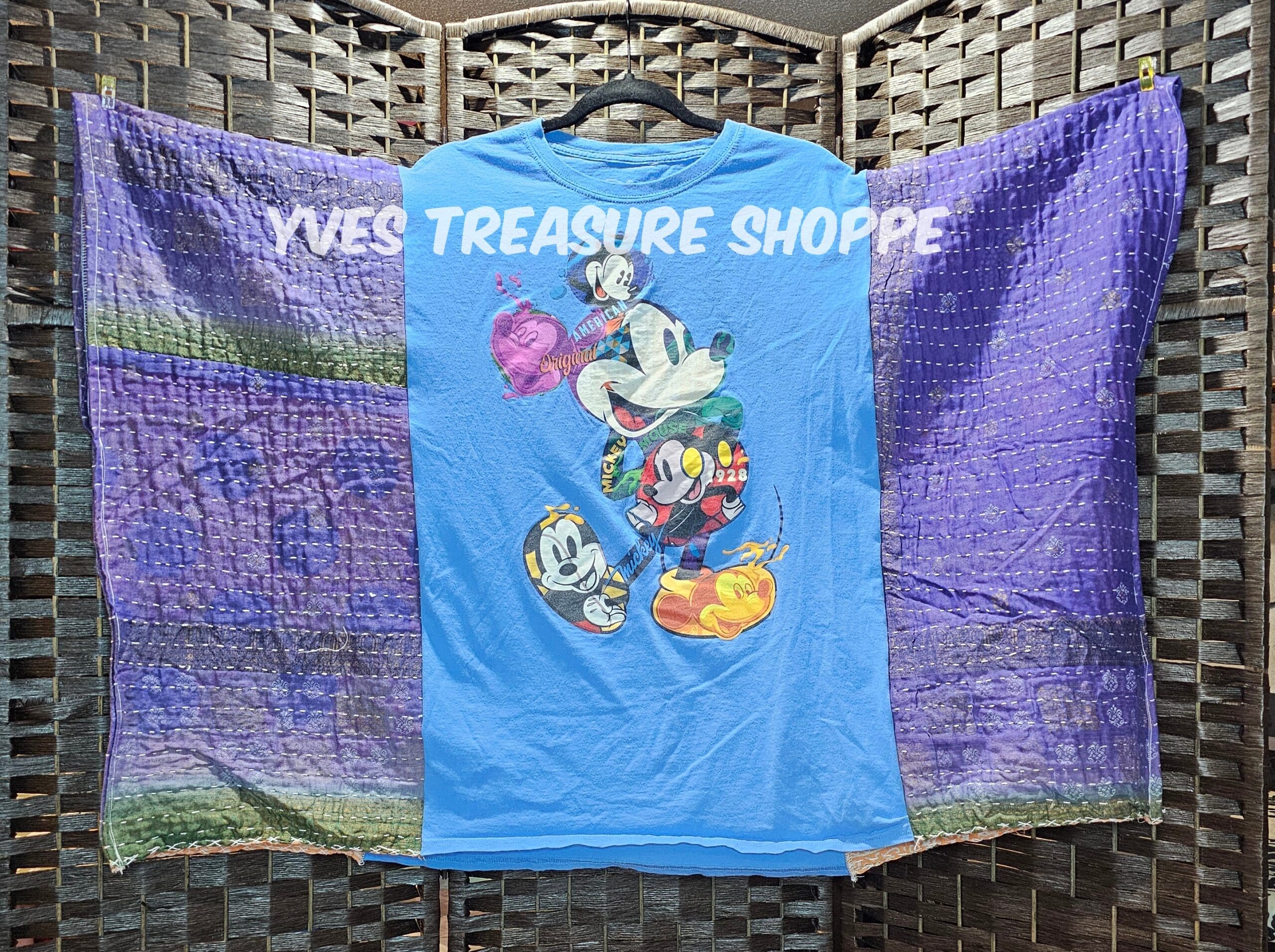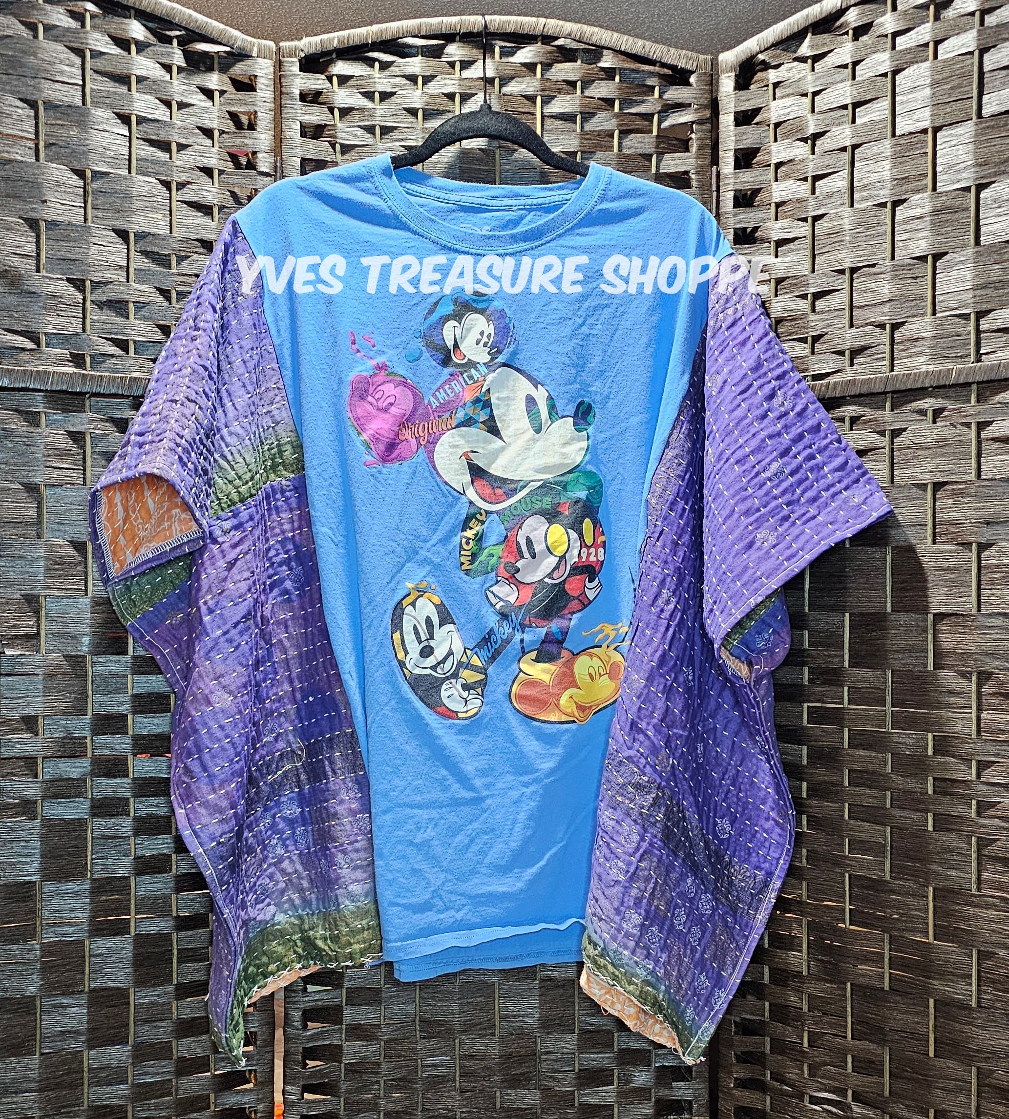 One Size. This Poncho top is made with a vintage Mickey Large t-shirt and vintage kantha quilt. 41 inches across. 26 inches from top to bottom. Sides are sewn partway up, to be able to be worn as a top. Perfect for making that fashion statement.