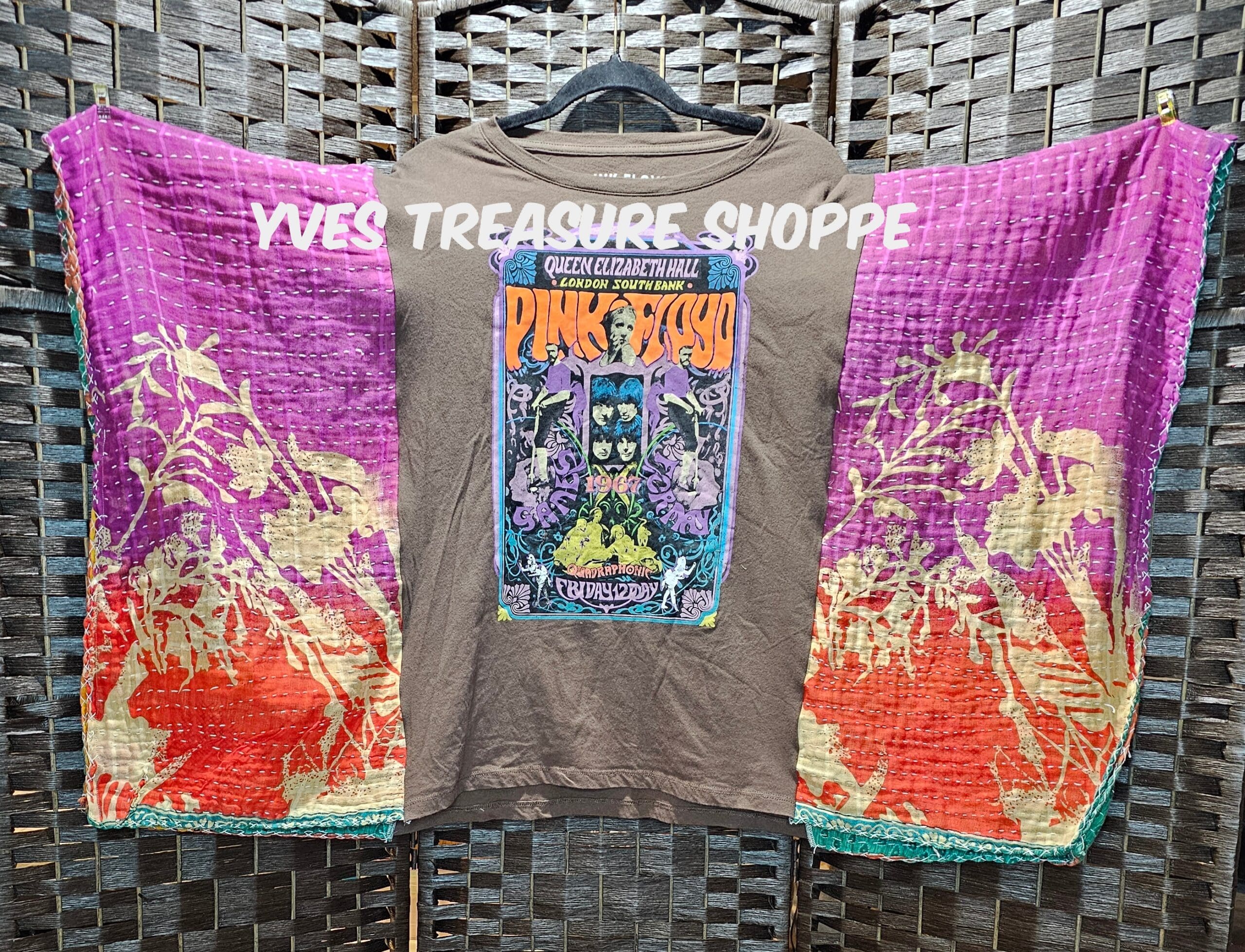 One Size. This Poncho top is made with a New Large Pink Floyd t-shirt and a vintage kantha quilt. 44 inches across. 26.5 inches from top to bottom. Sides are sewn partway up, to be able to be worn as a top. Perfect for making that fashion statement.