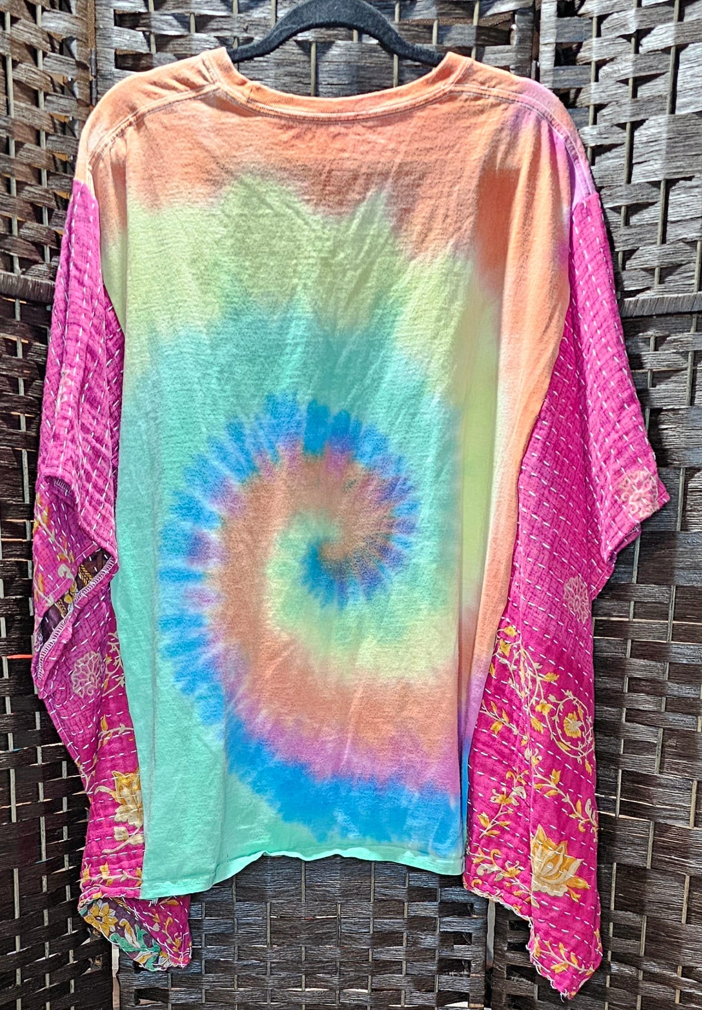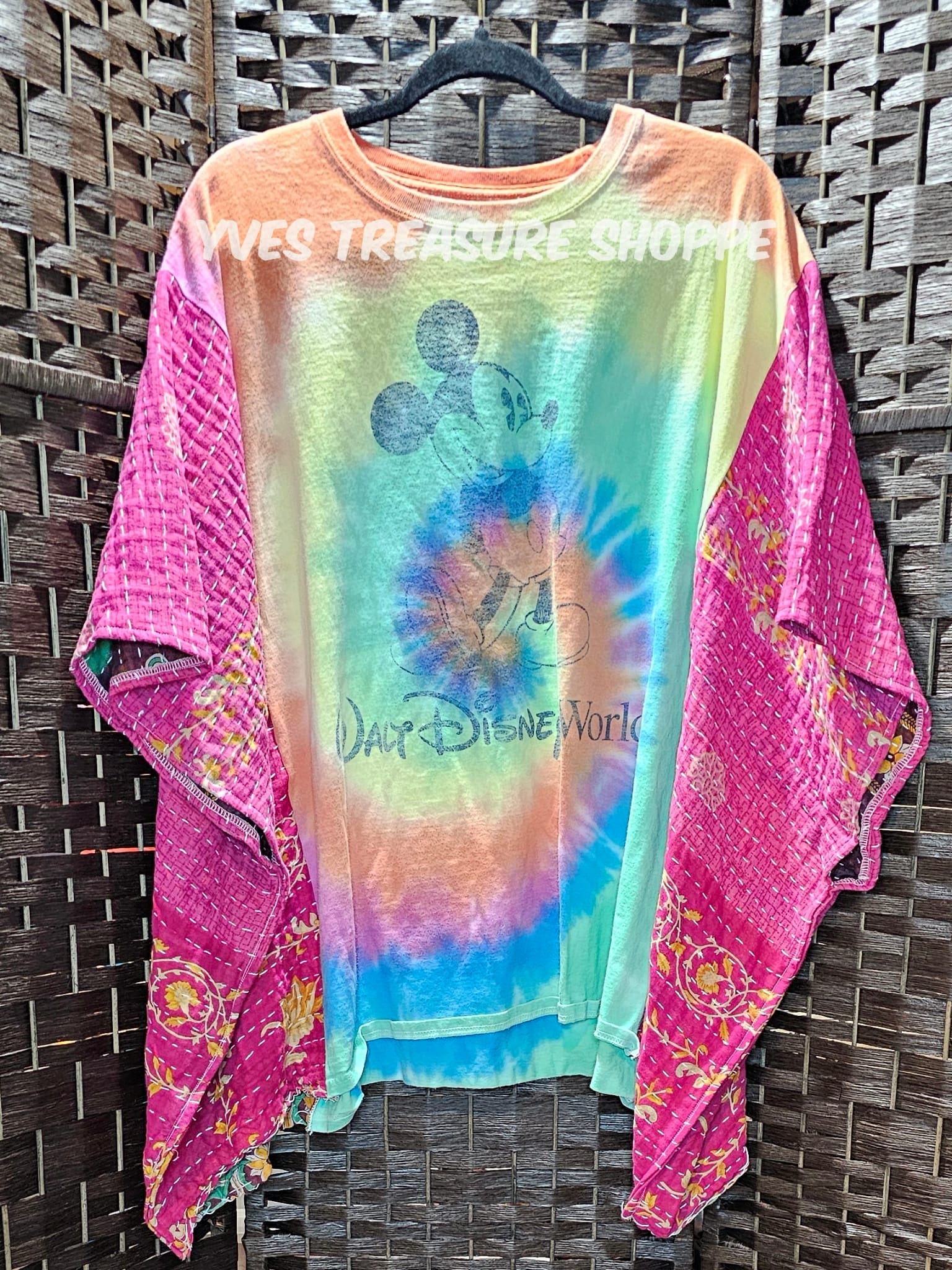 One Size. This Poncho top is made with a vintage Xlarge Mickey t-shirt and vintage kantha quilt. 43 inches across. 28 inches from top to bottom. OOAK. Sides are sewn partway up, to be able to be worn as a top. Perfect for making that fashion statement.