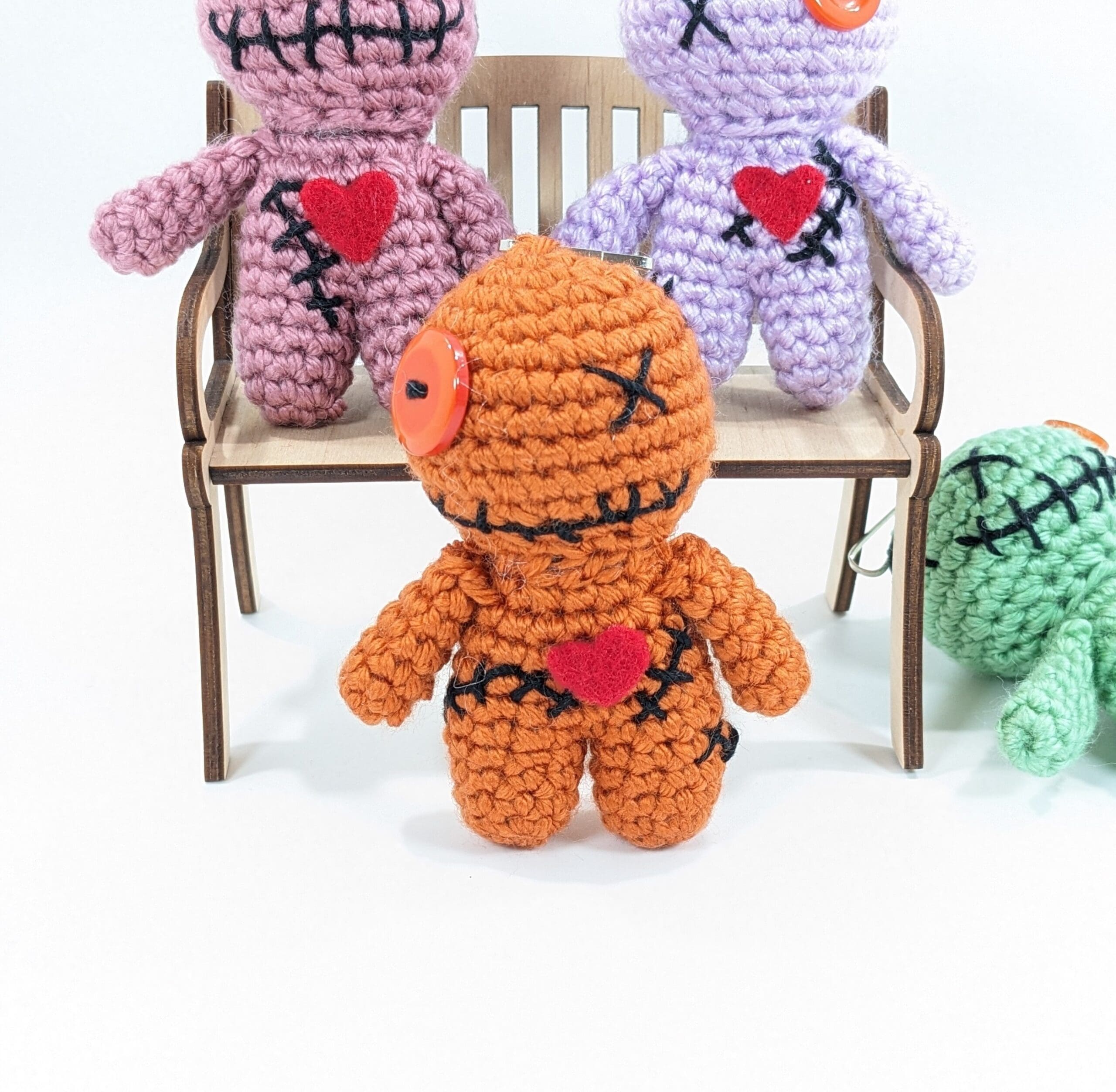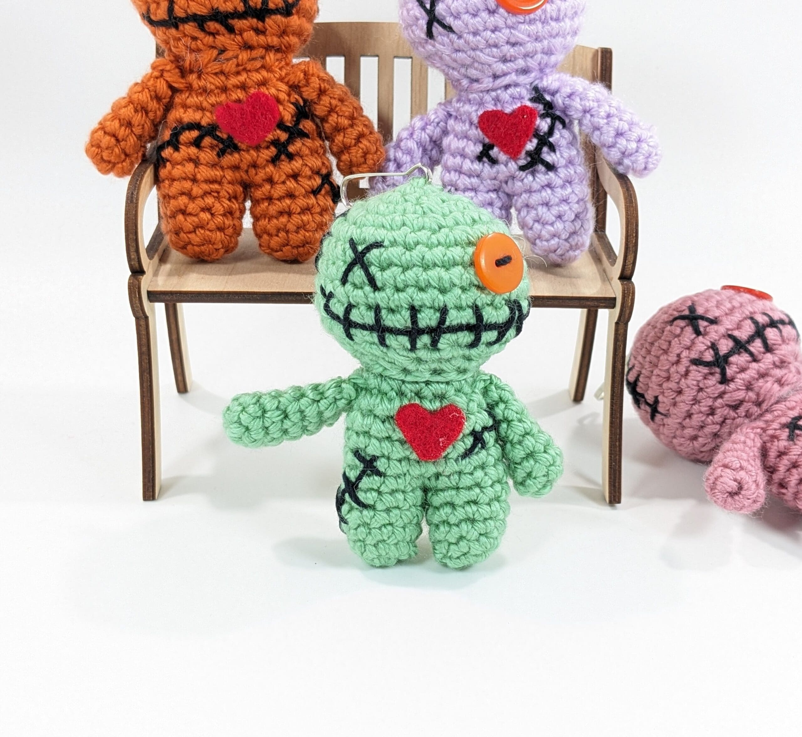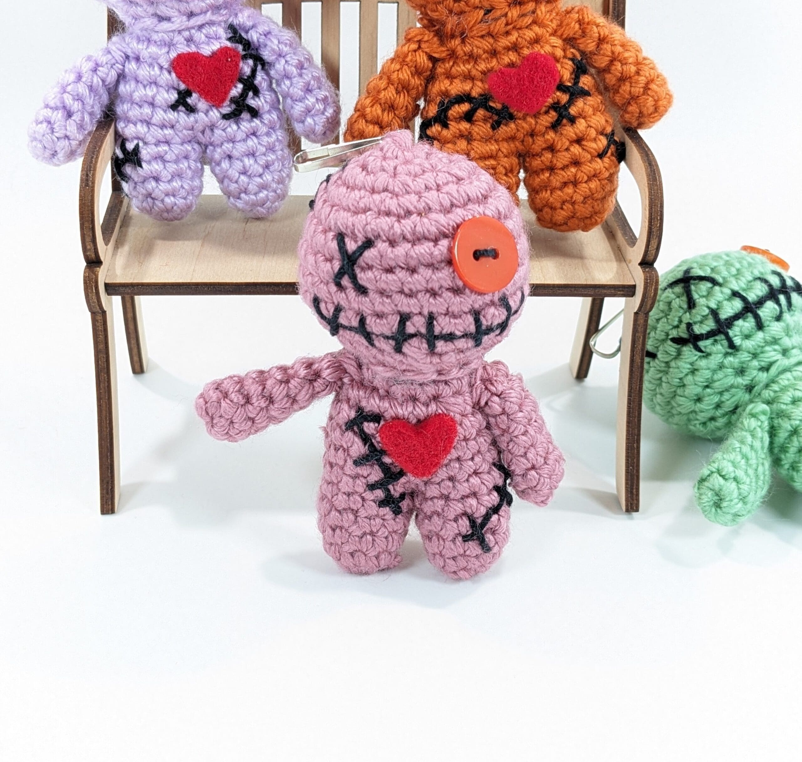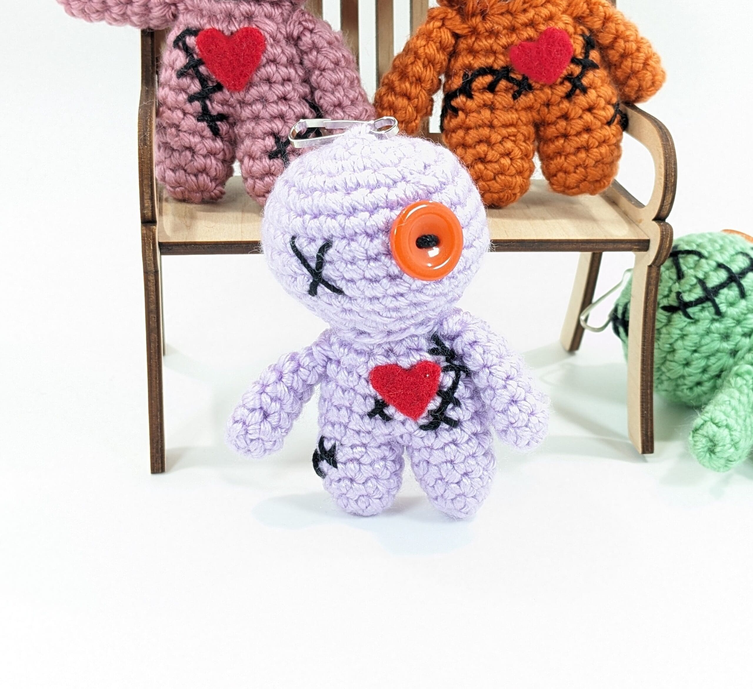 Also each Voodoo Doll Keyring Crochet Clip-on measures 3 1/2″ tall an is crochet with 100% acrylic yarn, There also is a button and a clip sewn on.