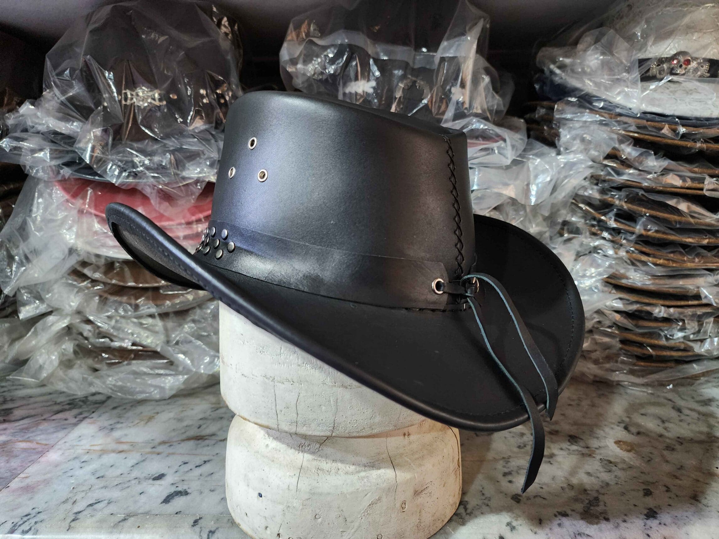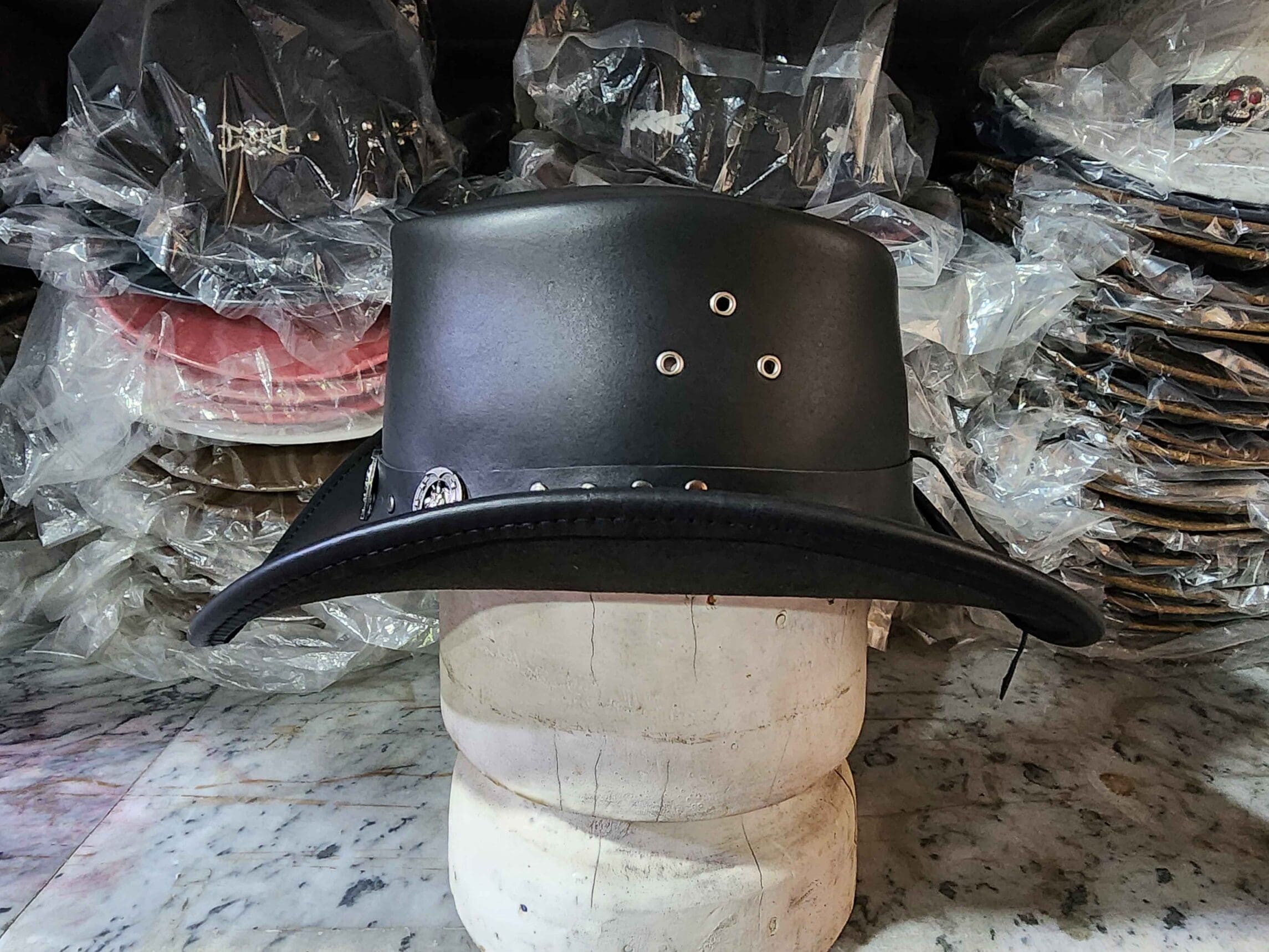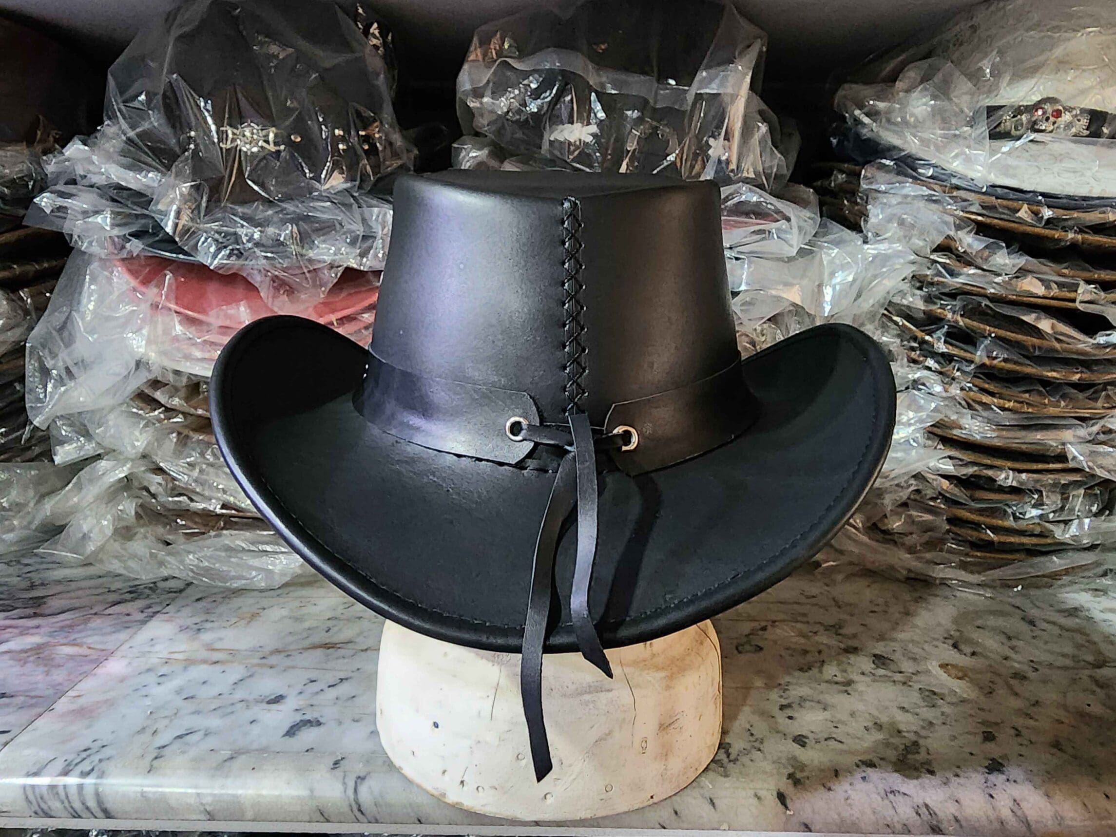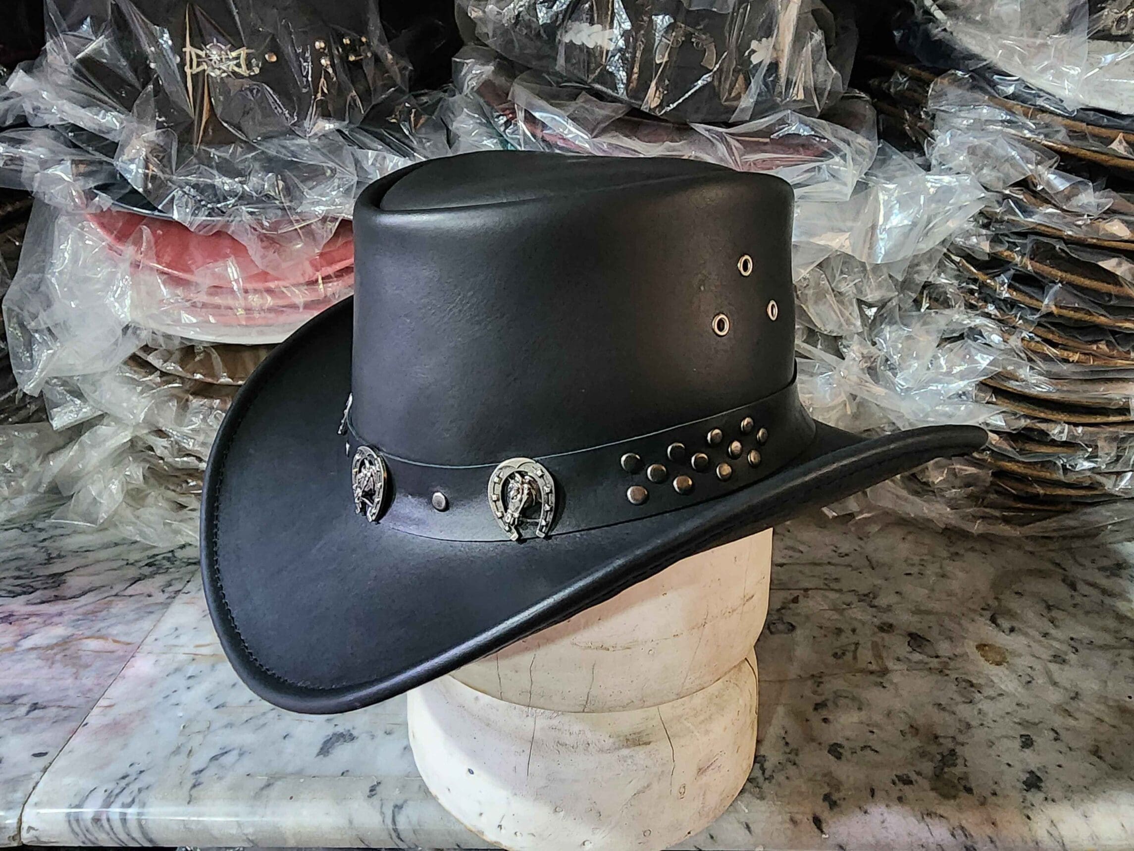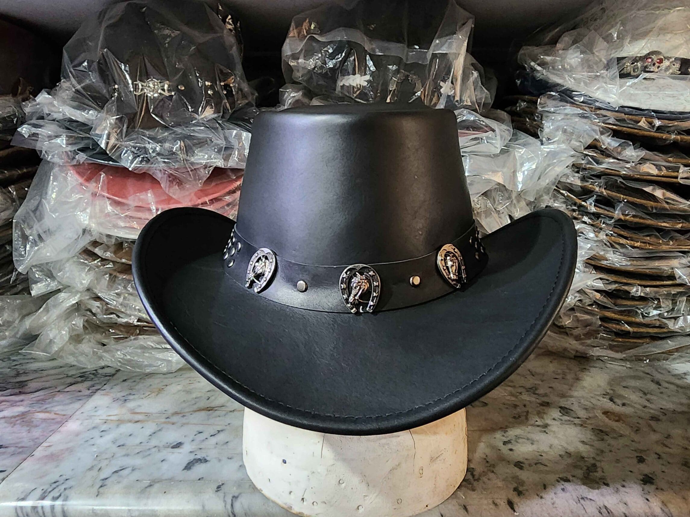 Perfect for cowboys, ranchers, or anyone looking to make a bold statement, this leather hat is ideal for outdoor adventures, rodeos, or casual wear.