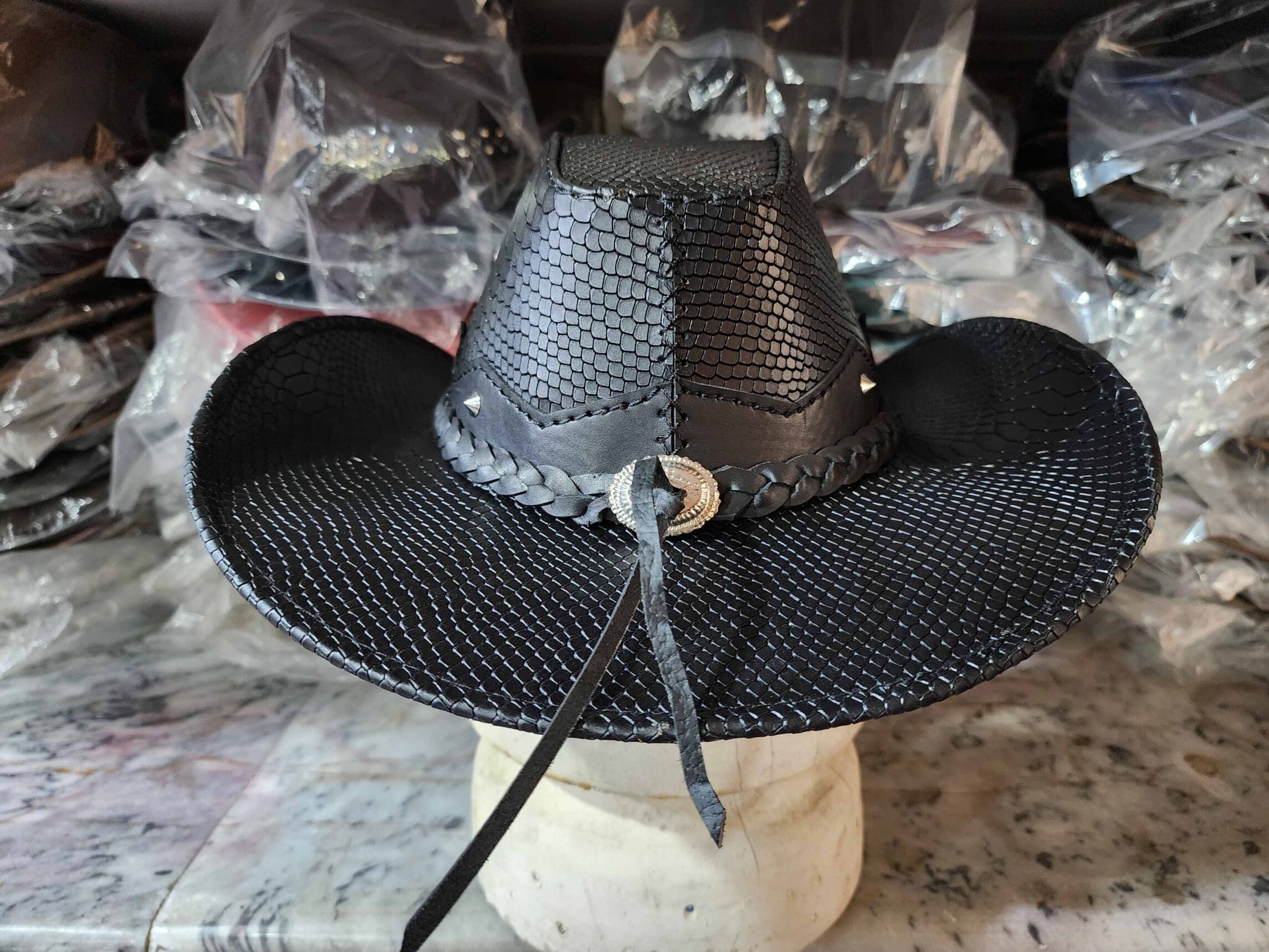 A Western icon cowboy hat made from anaconda skin texture leather would be a striking blend of rugged Western style and exotic luxury.