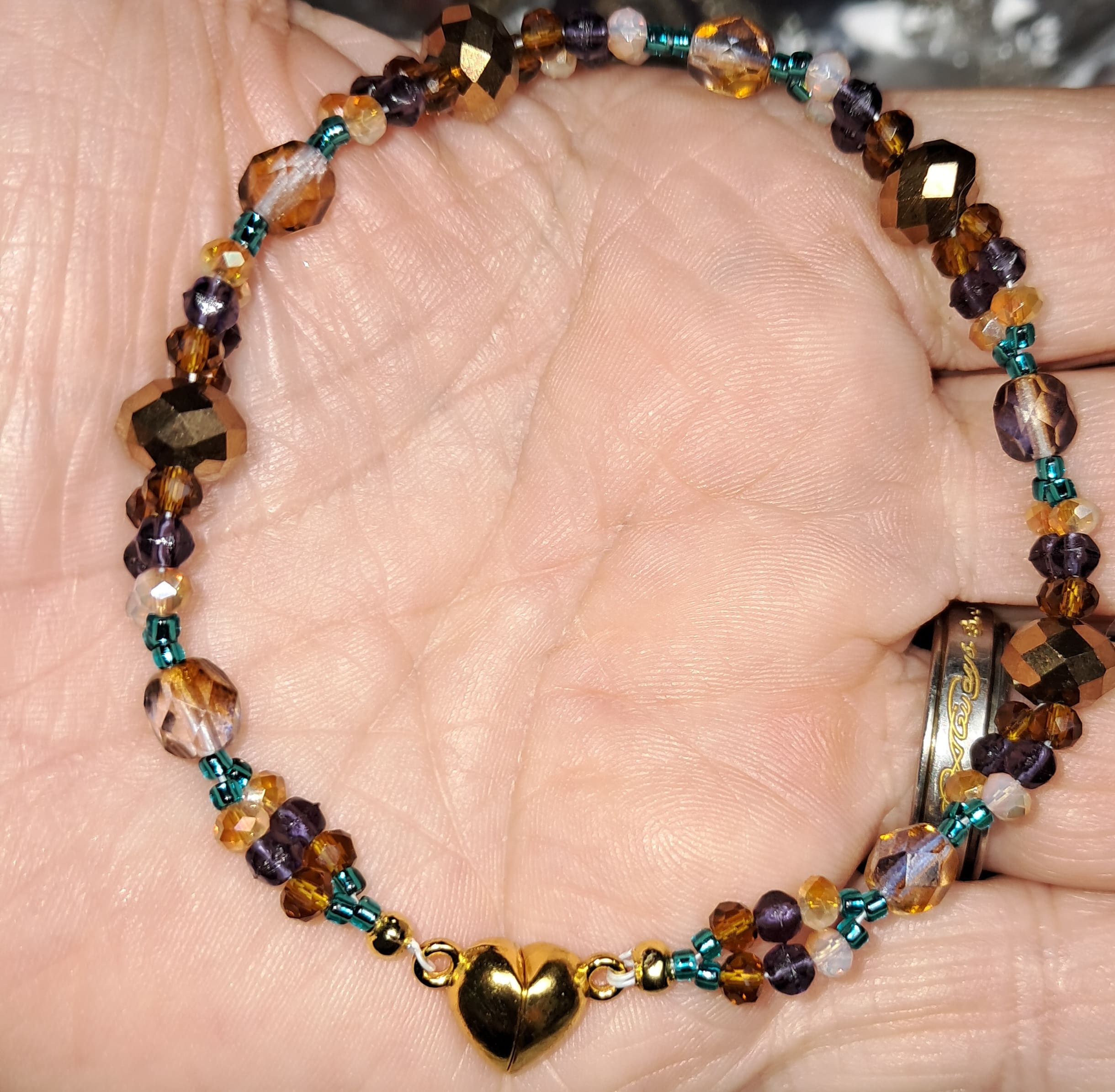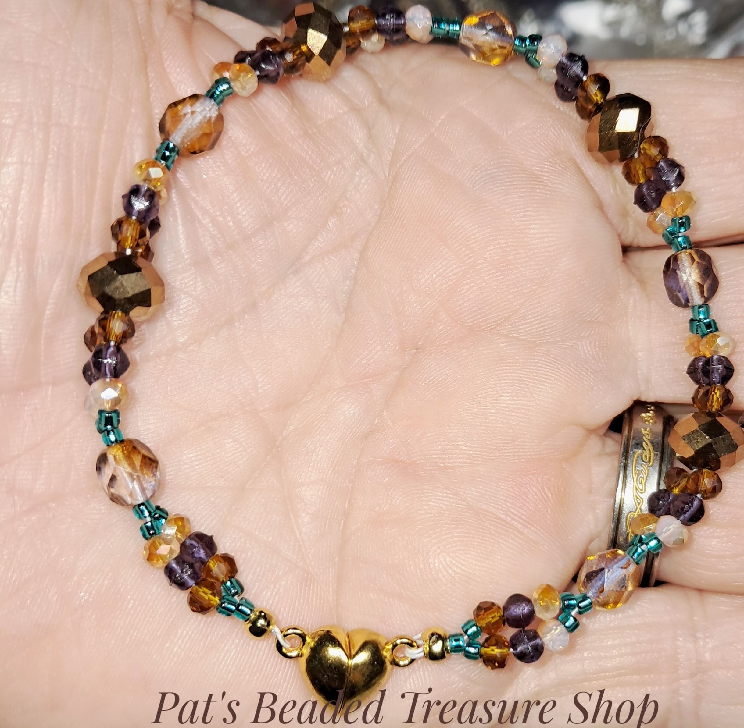A charming double-strand bracelet featuring warm amber crystals, deep plum beads, teal accents, and a sweet gold heart clasp.