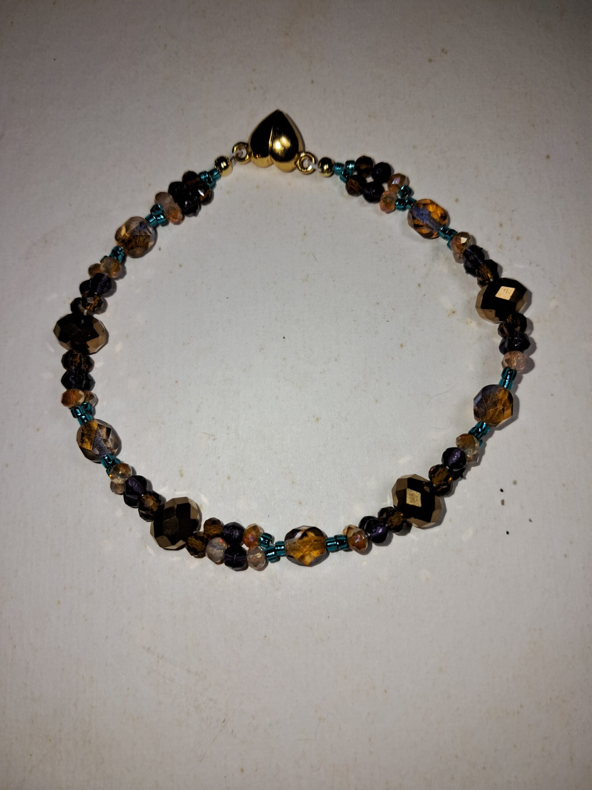 This whimsical double-strand bracelet blends warmth, sparkle, and playful elegance into one delightful design. Two coordinating strands are woven together with a mix of faceted amber-toned crystals, rich plum beads, soft champagne accents, and tiny teal seed beads that add a cheerful pop of color.