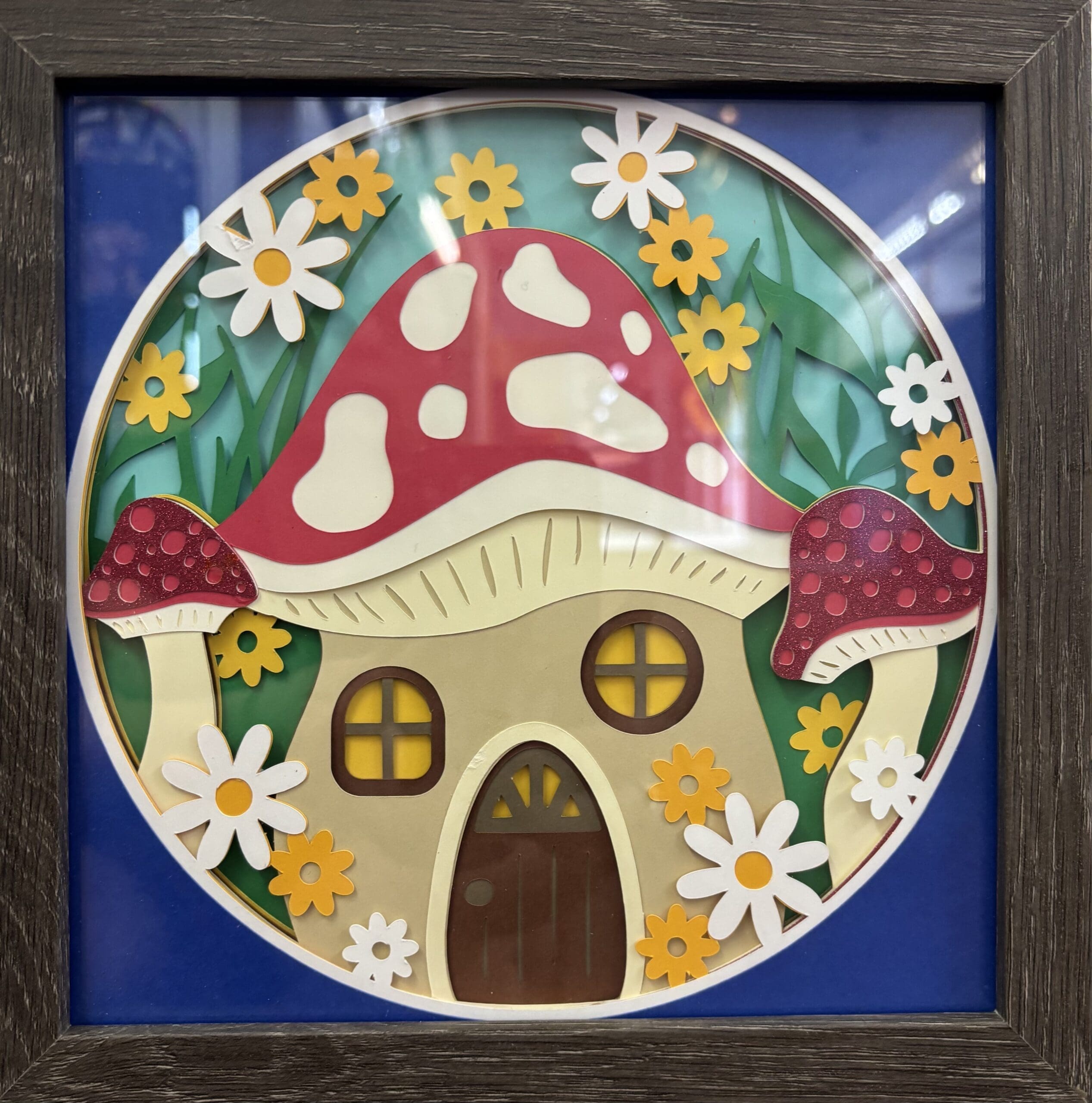 This handmade mushroom house shadow box brings a playful storybook cottage to life with layered detail and cheerful color. A charming piece designed to add warmth, imagination, and personality to any space.