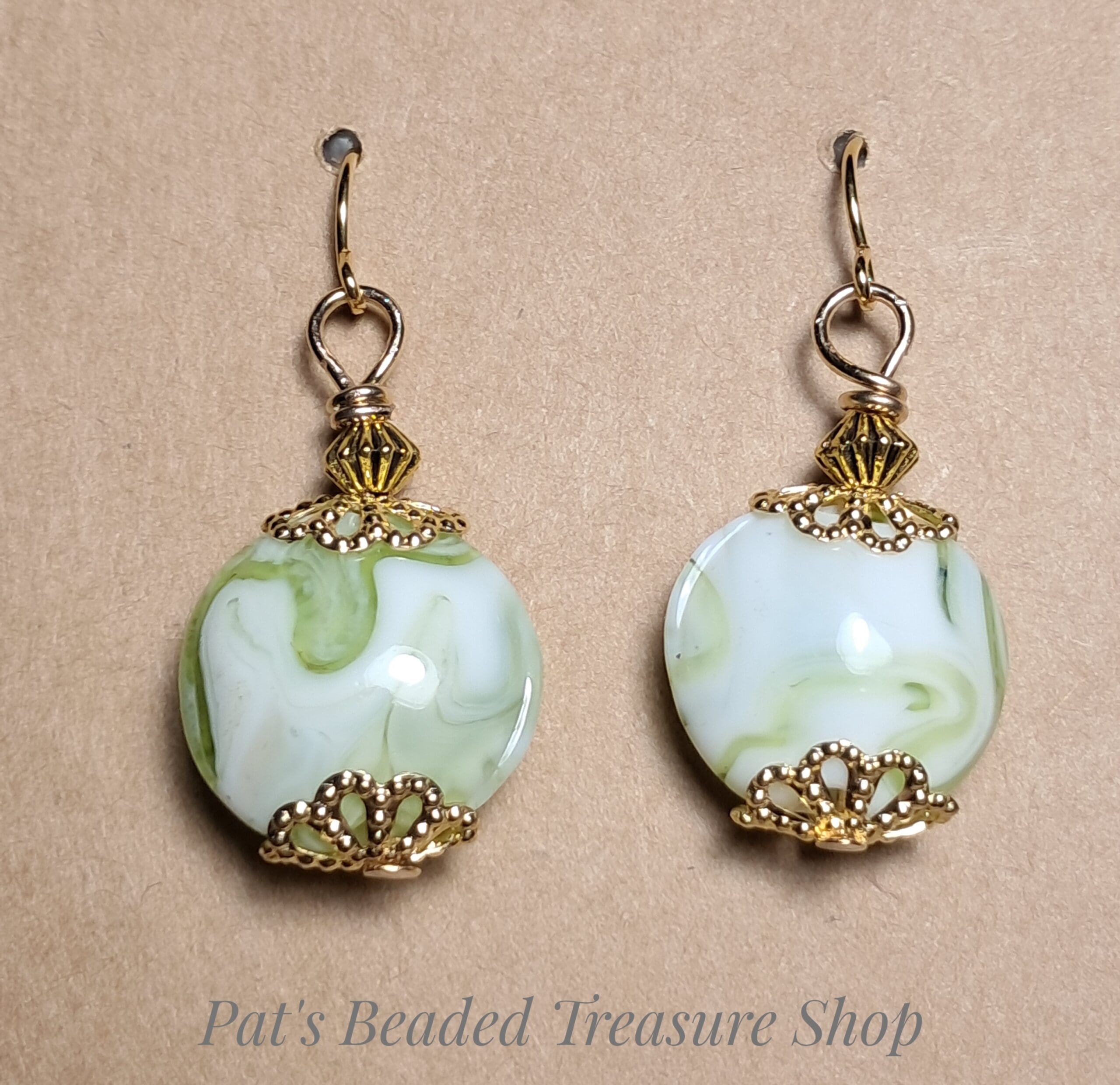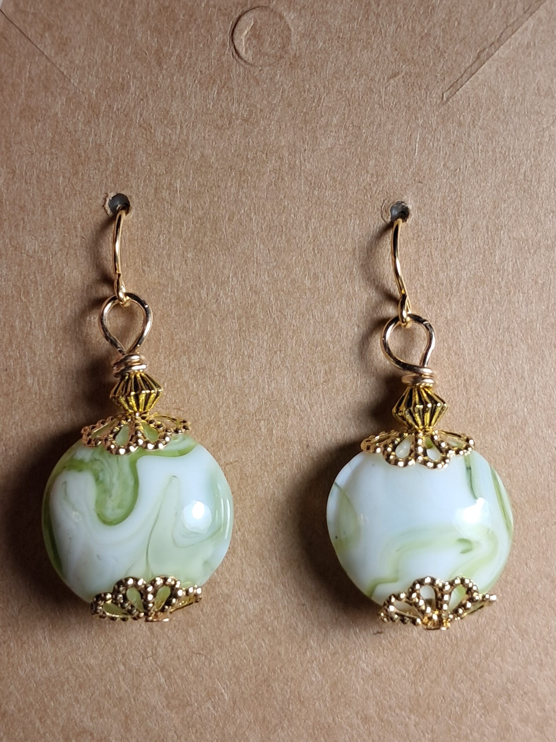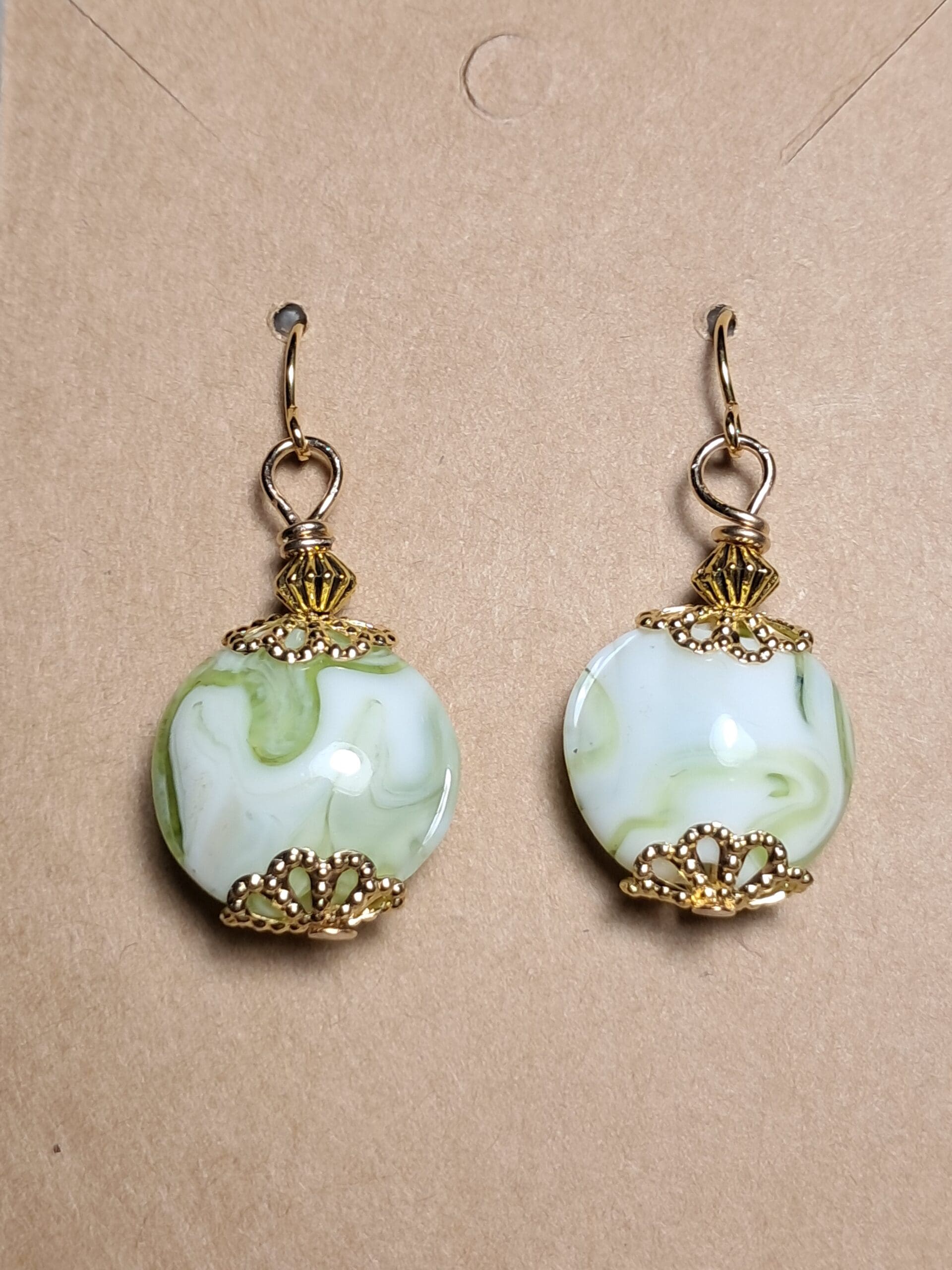 Handmade green and white swirl dangle earrings with gold filigree bead cap accents and gold plated ear wires. Lightweight and elegant for everyday wear or special occasions.