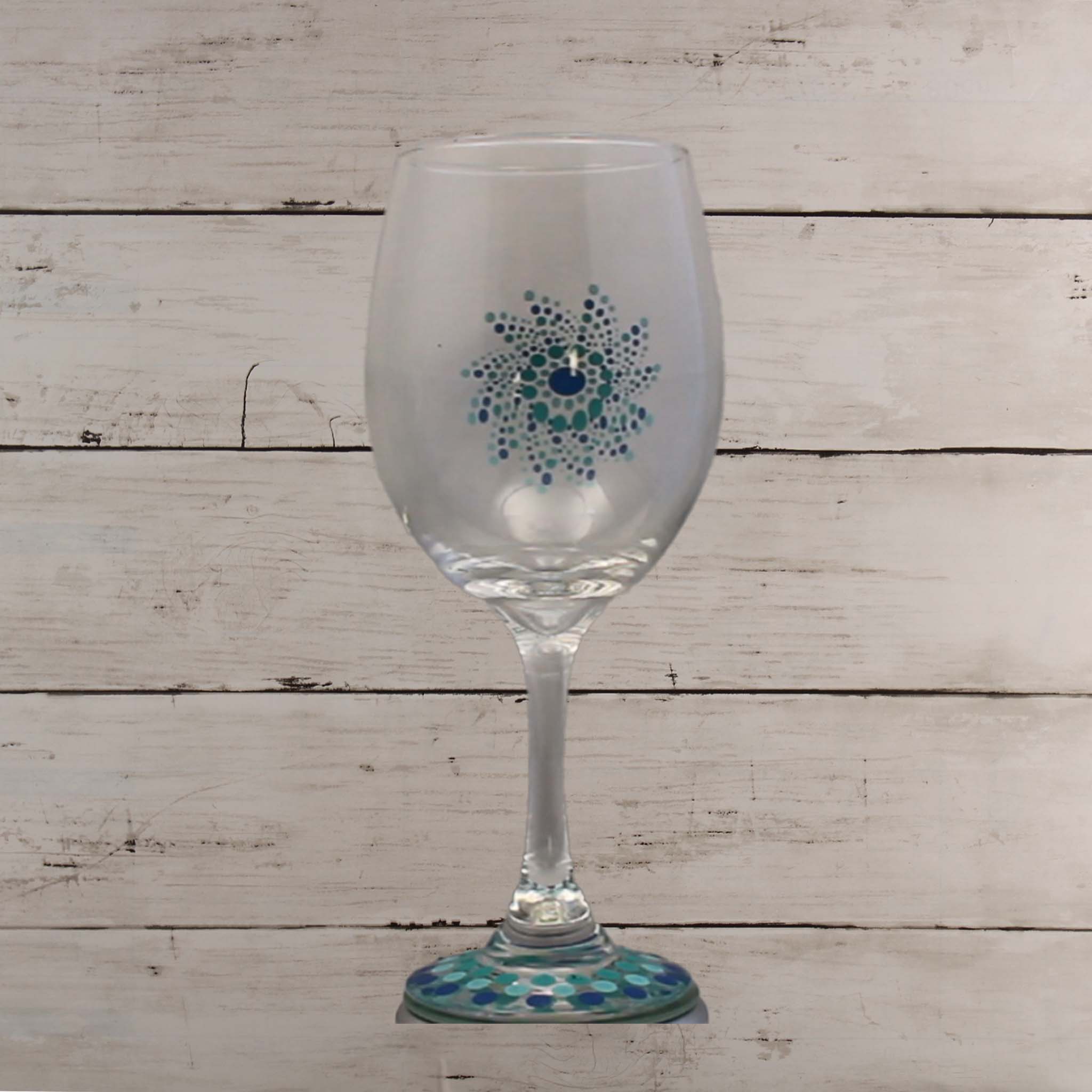 Hand-painted wine glass with a unique and eye-catching design. The bottom of the glass features a cluster of blue, green, and turquoise dots, creating a beautiful and vibrant base.