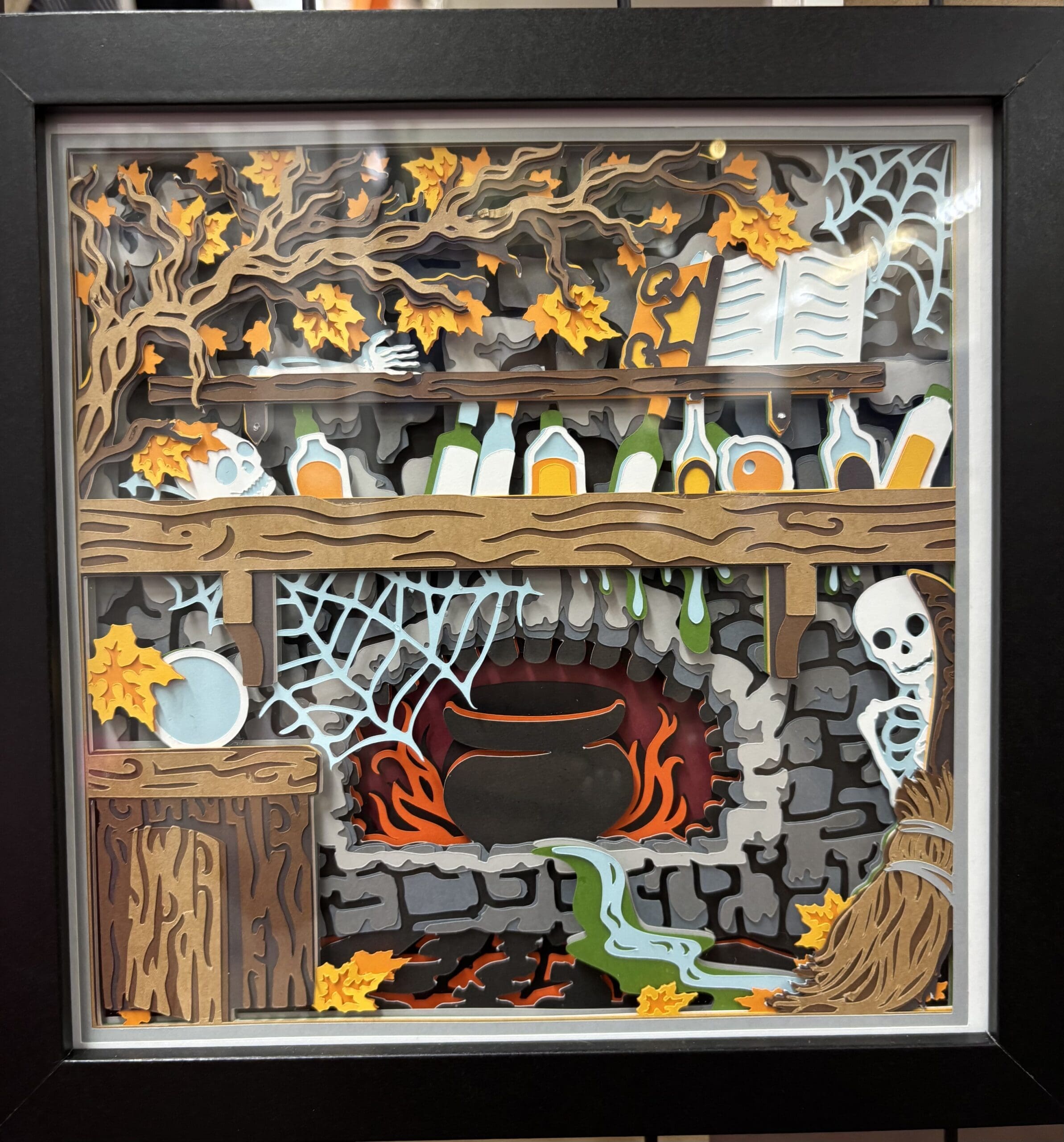 Crafted as a handcrafted shadow box, this piece uses multiple layered papers to create dimensional shadows that change with the light. The witch apothecary shadow box design blends spooky details with warm fall tones, making it ideal for Halloween decorating while still fitting into broader autumn decor themes. The potion shelf and cauldron imagery evoke classic witch lore, appealing to fans of traditional Halloween aesthetics.