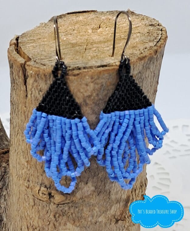 I stitched tiny black seed beads into the shape of a witch’s hat, and finished them with bold blue fringe beads that swish when you move. They’re playful, lightweight, and just the right mix of cute and witchy. 🧙♀️💜