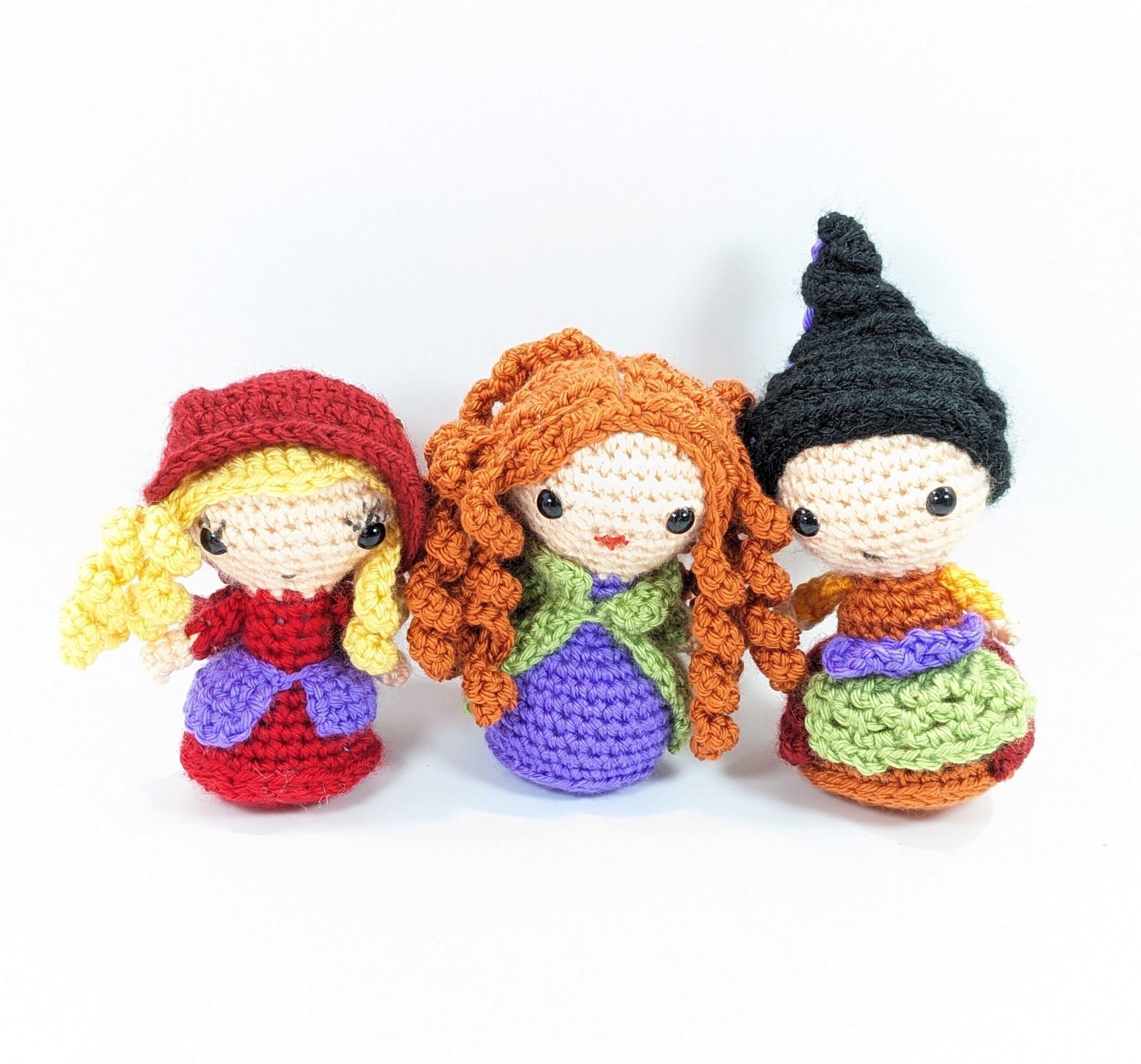 Witch Sisters Crochet Mini Dolls. You get a set of three crochet witch dolls to decorate your home for Halloween. Also each doll measures 5 inches tall. You can find a smaller set in my shop. Also there is a large selection of Halloween decor to choose from in my shop, link below.