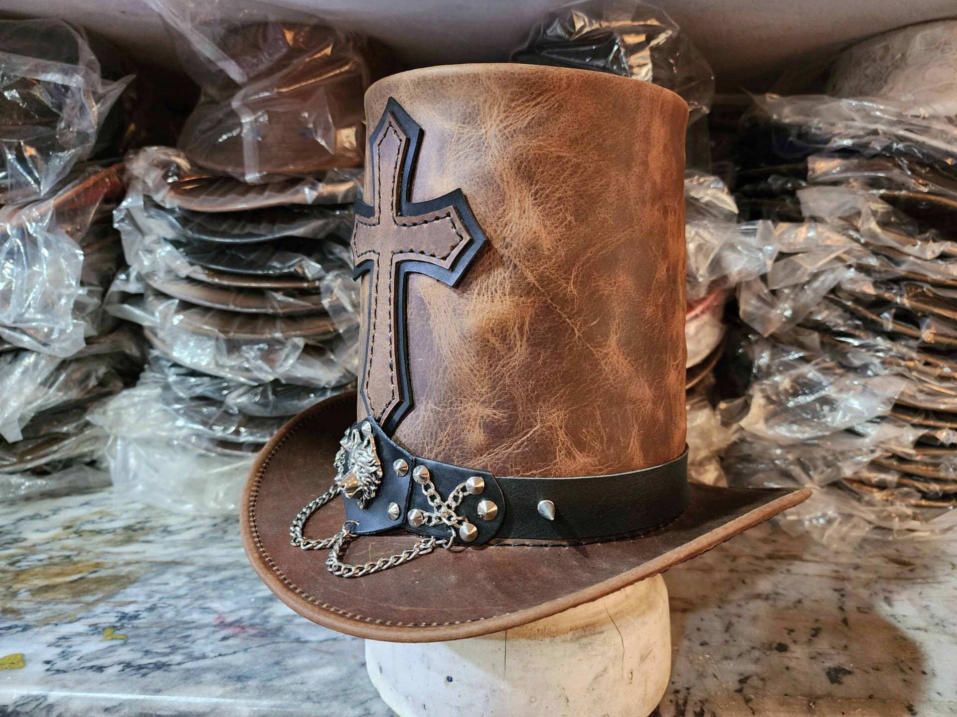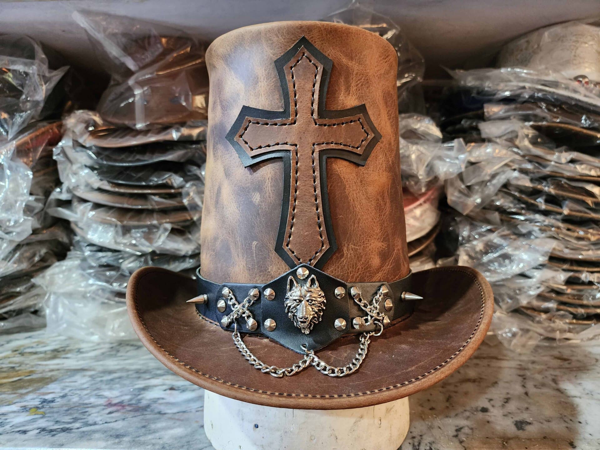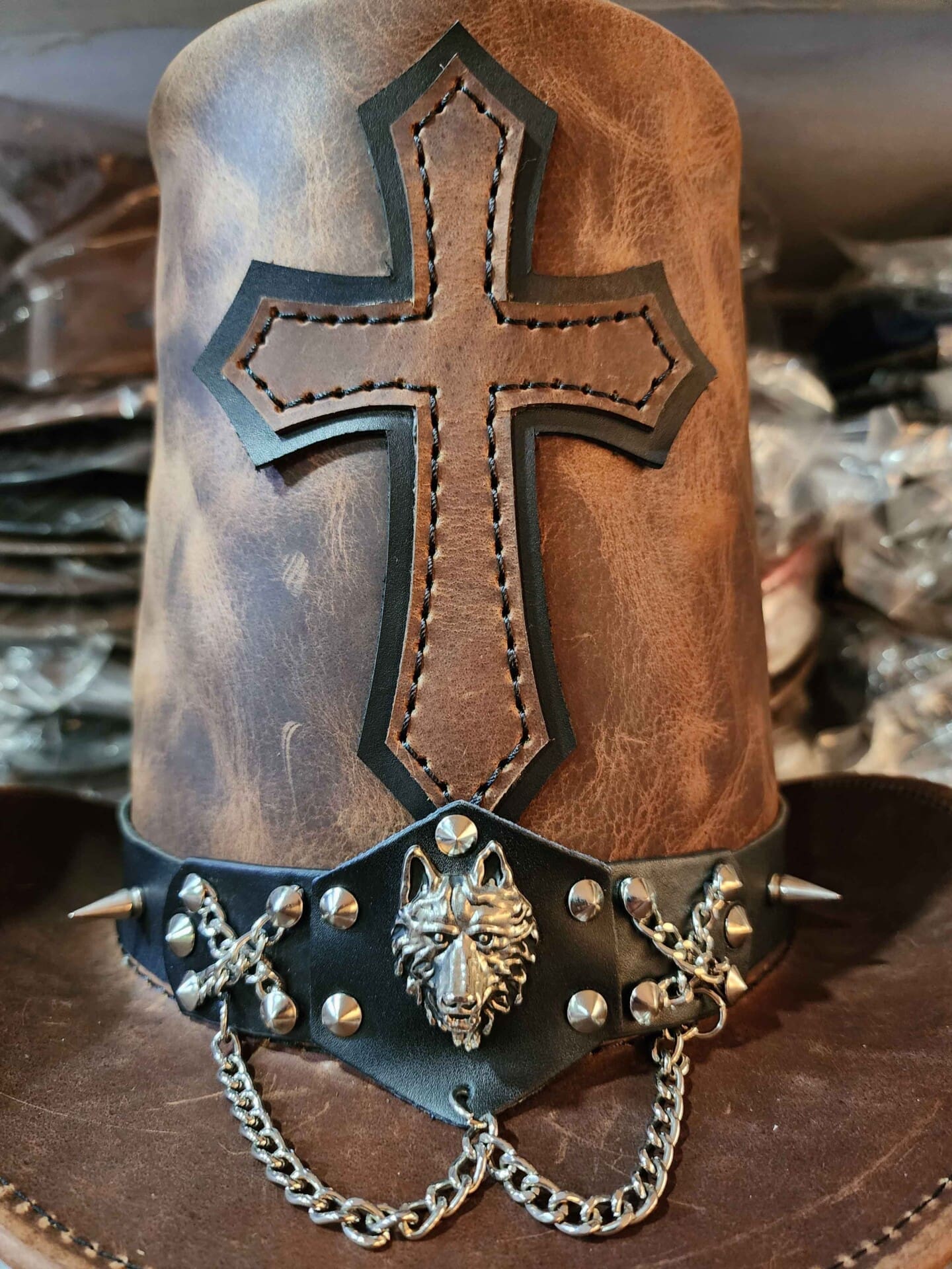 The tall crown is accentuated by meticulously hand-stitched leather cross detailing, adding to its mystical, battle-worn aesthetic.